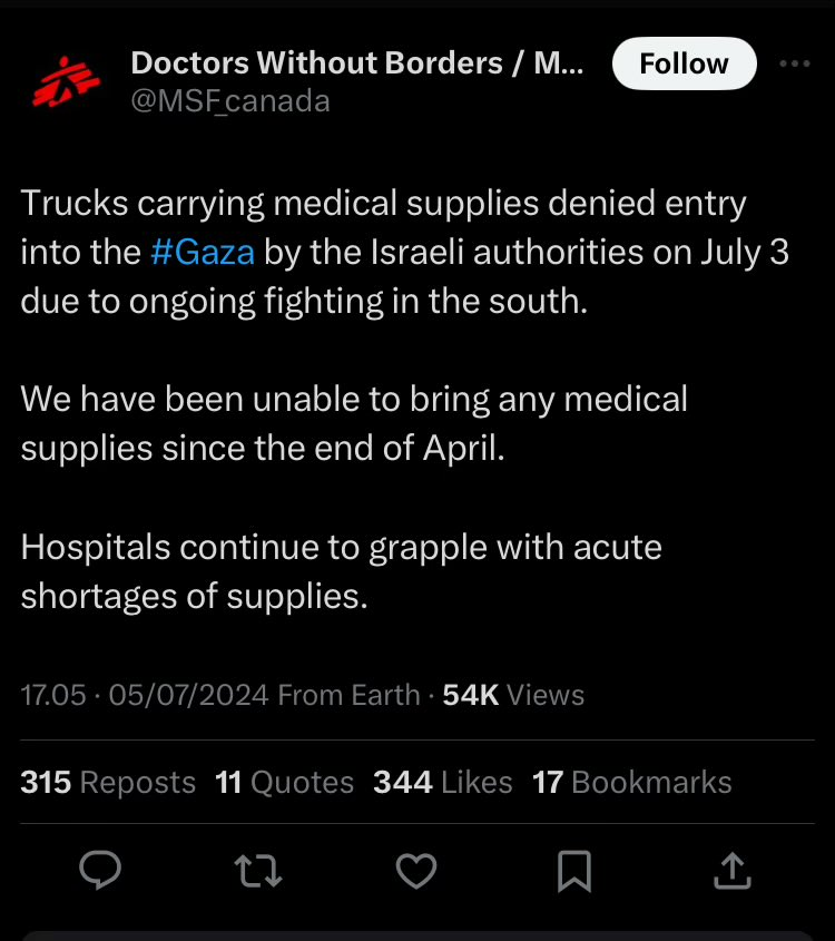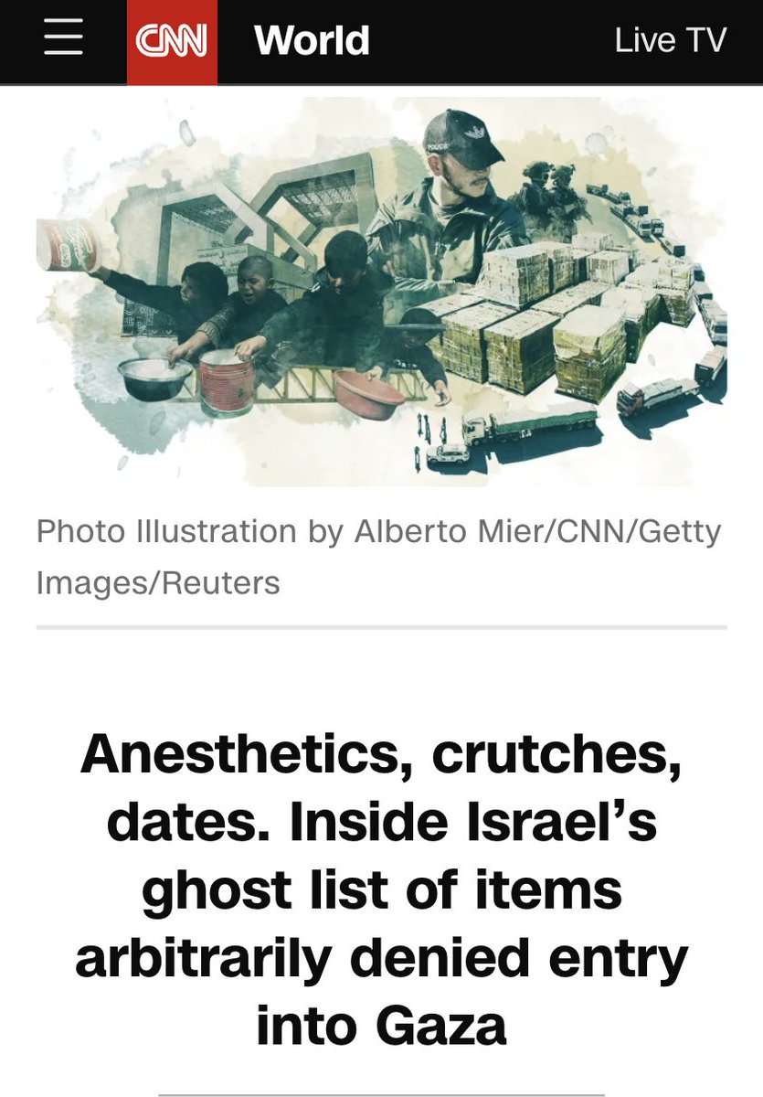 ๐จItems Israel blocks from entering Gaza: Sanitary pads Maternity kits Children's toys Cancer medicine Water purification tablets Oxygen cylinders X-ray machines Sleeping bags Nail clippers Anesthetics Generators Ventilators Crutches Dates... โIt is perfectly engineered chaosโ https://t.co/AWuXEn63u6