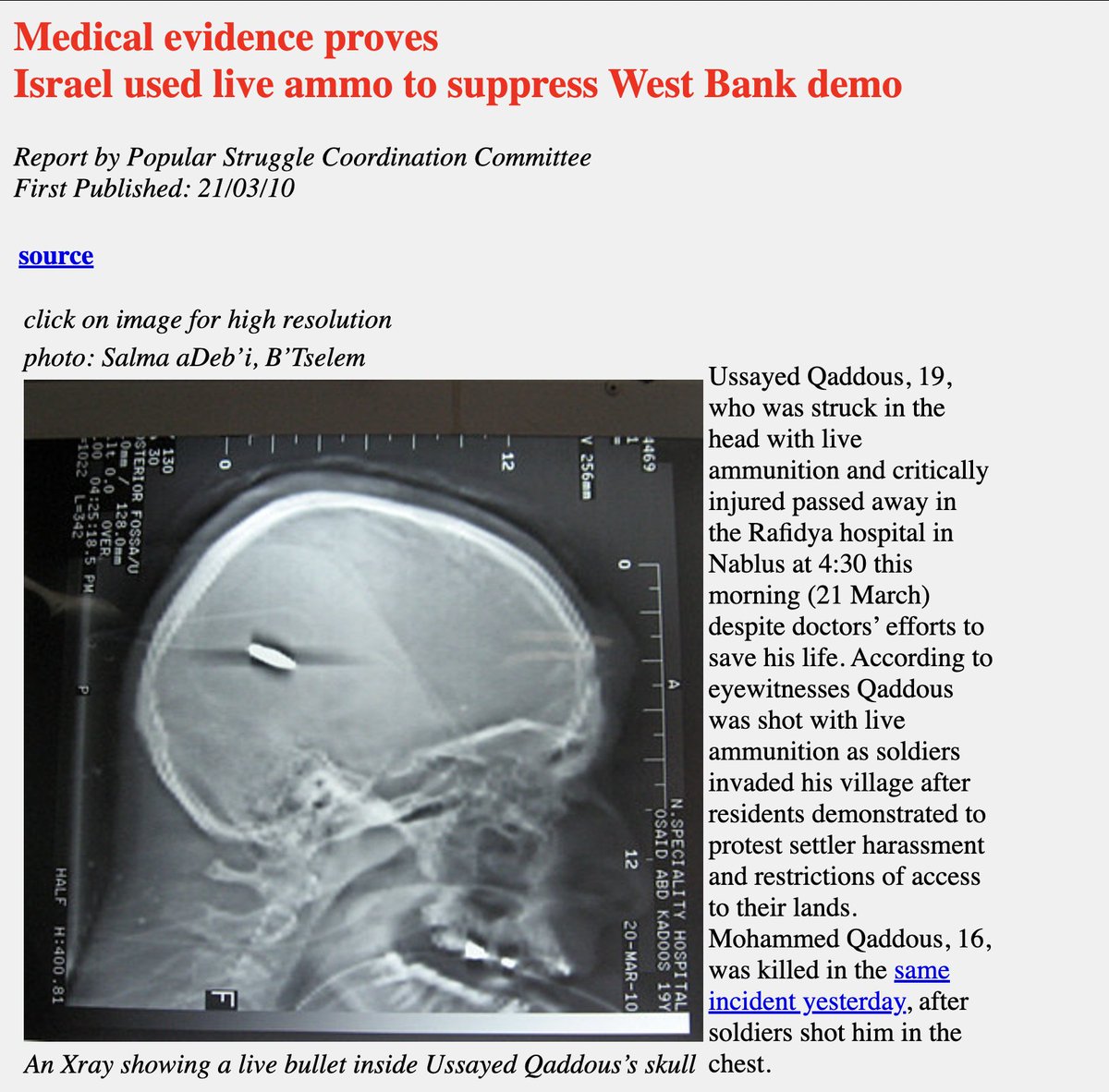 ๐จTo the atrocity deniers questioning the authenticity of 65 medical experts testimony that Israel is shooting children in their skulls: 1- The NYTimes article NEVER mentioned a 5.56 caliber bullet. It's possible Israel shot those kids with armed quadcopter drones or many other weapons the IDF uses. What we know for sure is that those kids didn't shoot themselves & Palestinians don't shoot their children, you racist scum! 2- Here are almost identical old X-ray scans from Israeli media & Israel's top human rights org. Do you doubt the authenticity of those x-rays as well, you shameless schmucks? 3- Your fake "expert opinions" & blatant lies are exactly the same Israel used to deny its murder of Muhammad al-Durrah in 2000, even though it was all filmed on camera for the whole world to see! Israel 1st admitted it was them "by accident", then quickly denied & brought a number of "medical experts" & "ballistic experts" to absolve it of any responsibility with the most retarded lies! Then Netanyahu went further in 2013 to conclude al-Durrah was never shot in the 1st place. Perhaps that'll be your next conclusion, you craven monsters! 4- To insinuate 65 medical experts cannot be trusted b/c some of them are Muslim & therefore biased only outs you as racist scum. Imagine someone saying "don't trust anything Tony Blinken or Jake Tapper says about Israel b/c they're Jewish", how you'd flip & go rabid?