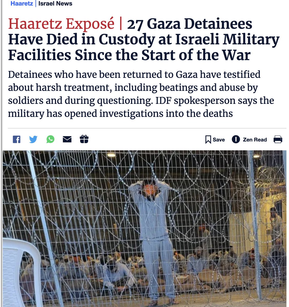 7\ Over 27 Gazan hostages died from torture at the Sde Teiman "concentration camp", which includes burning, electric shocks, beating... Yes, they're hostages b/c they're kidnapped by Israel from Gaza as a bargaining chip in negotiations with Hamas; they're not charged or tried! https://t.co/HmIQ1DSUpi