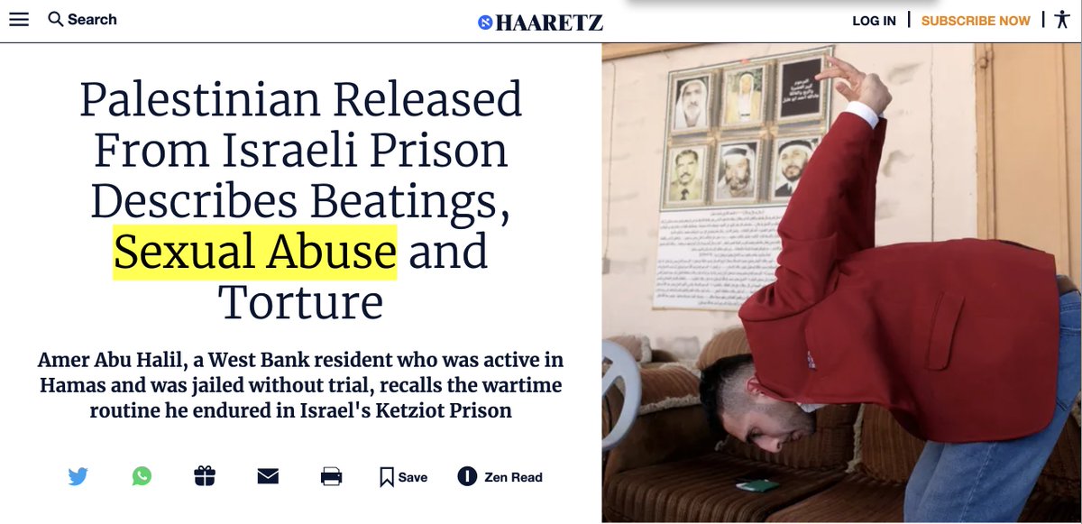 3\ Most Palestinian victims of Israeli sexual abuse would never speak up about their trauma out of fear of Israel arbitrarily detaining or killing them in revenge, as well as the social stigma & shame it brings Those speaking up are doing so at great risk https://www.haaretz.com/israel-news/twilight-zone/2024-04-28/ty-article-magazine/.premium/palestinian-released-from-israeli-prison-describes-beatings-sexual-abuse-and-torture/0000018f-15e9-d2e1-a7df-15efb6590000
