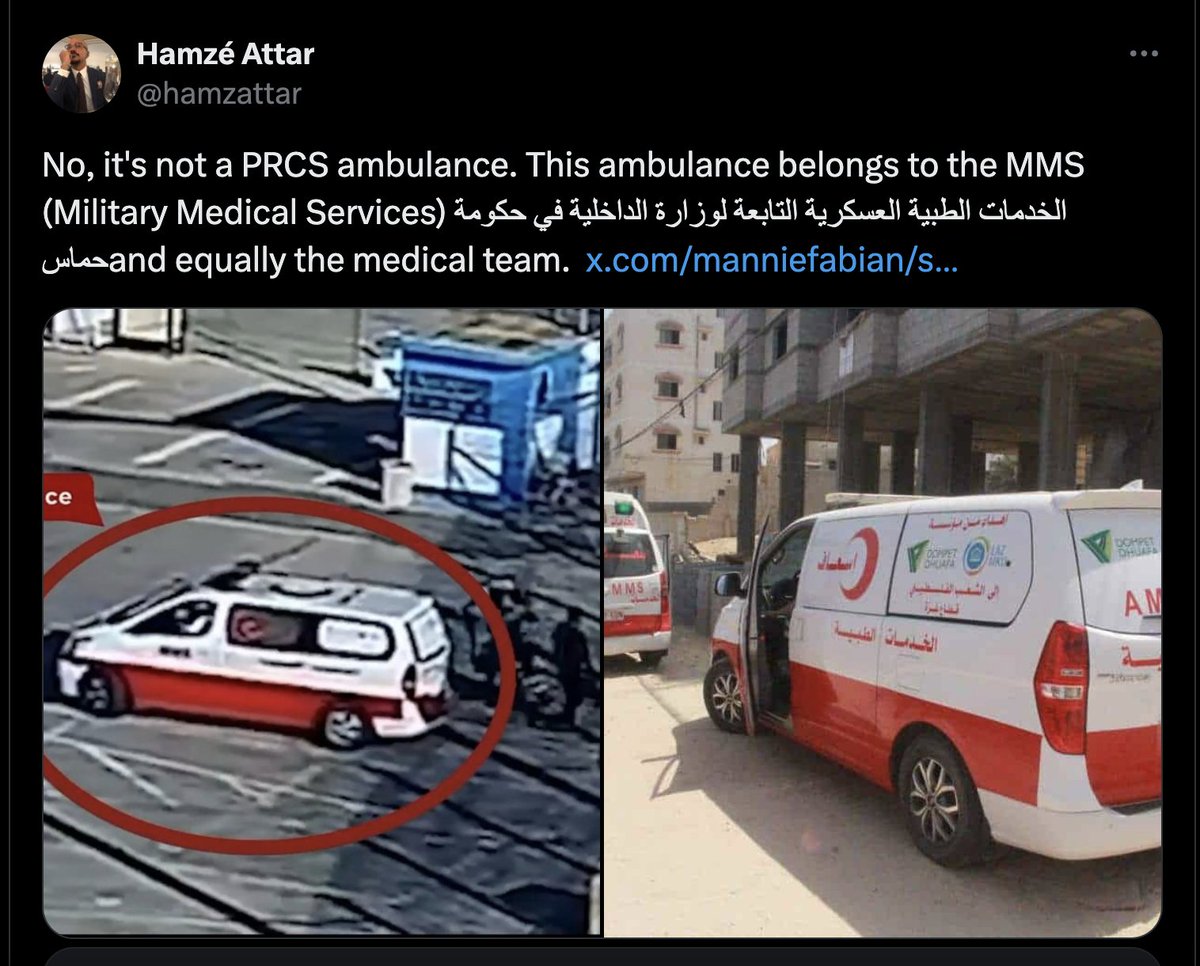 17\ The IDF also went after the @PalestineRCS & claimed they took part in Oct 7. The video the IDF provided was quickly debunked & the paramedics appearing in it were shown to be part of Hamas' "military medical service" https://t.co/CHAOI5PiTD