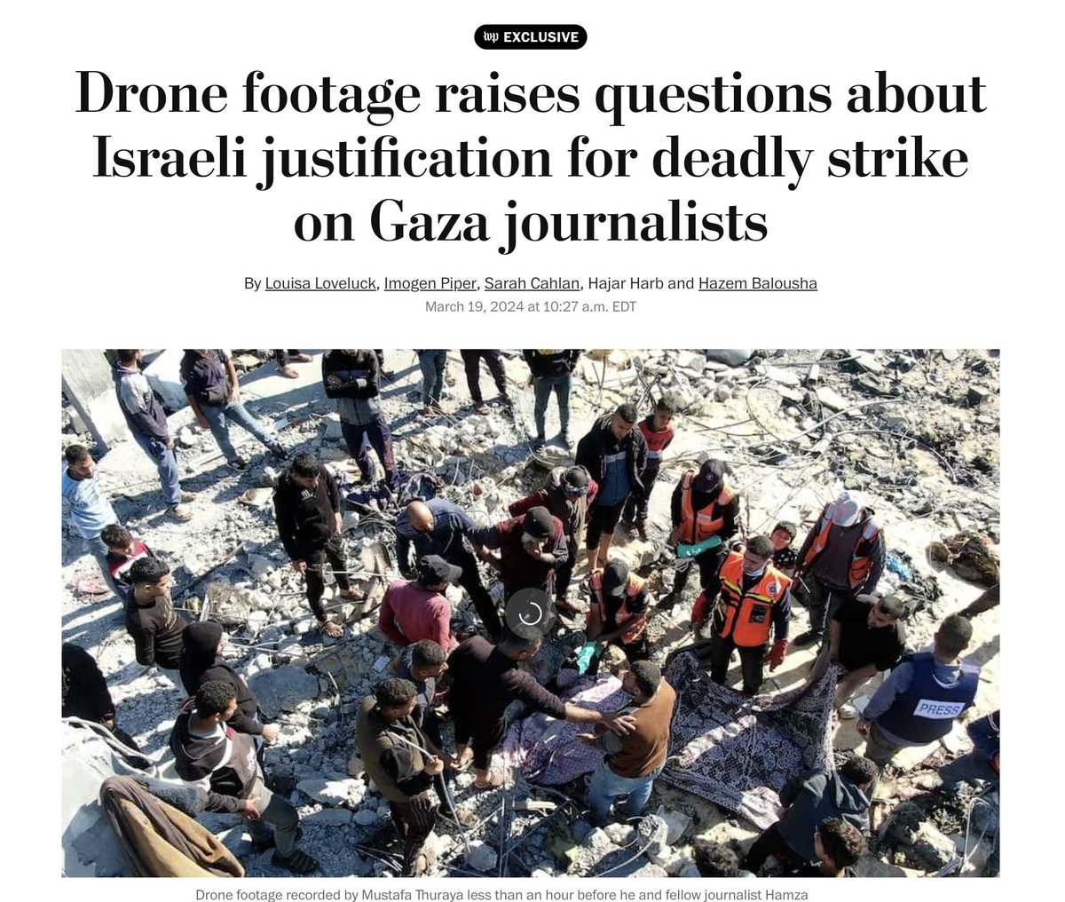 18\ In Jan, Israel assassinated Wael al-Dahdouh's eldest son & journalist Hamza in Rafah & claimed he was a PIJ militant filming IDF troops with a drone. Washington Post found that Israel lied again & Hamza only filmed a destroyed building & were unaware of any IDF troops in the area https://www.washingtonpost.com/world/2024/03/19/gaza-journalists-killed-israel-al-jazeera-footage/