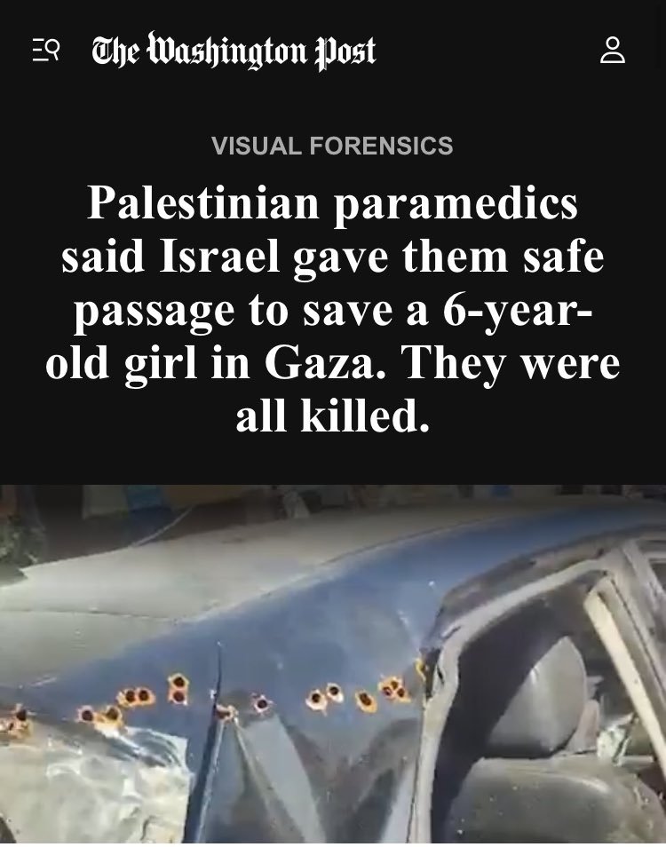 19\ The Washington Post recently found that Israel LIED about killing Hind (6) & her relatives in a car then bombing an ambulance that came to rescue the girl with Israel's prior approval. Israel said they were NOT even in that area at all & didn't kill anyone. "WashingtonPost investigation found that Israeli armored vehicles were present in the area... & that gunfire audible as Hind & her cousin Layan begged for help, as well as extensive damage caused to the ambulance, are consistent with Israeli weapons"