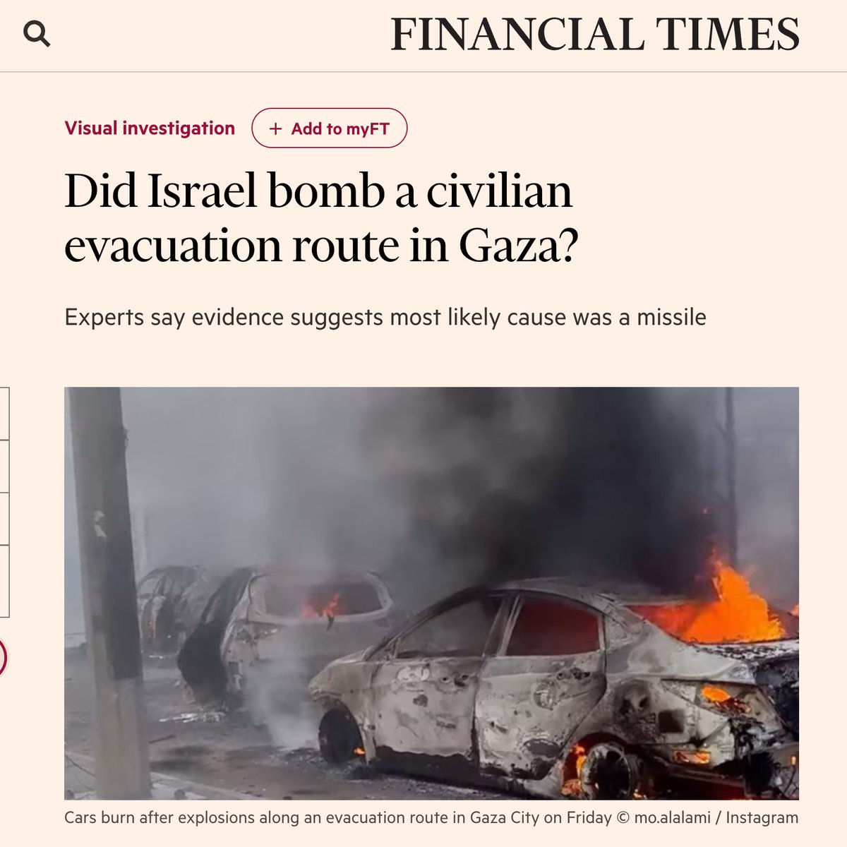 2\ Bombing fleeing refugees: Israel bombed a convoy of Gazans fleeing south on the very "safe road" they ordered to go through, killing over 70 on Oct 13. Israel immediately denied bombing the convoy & said it was Hamas. Financial Times found Israel was lying. The damage was consist with an Israeli airstrike! https://www.ft.com/content/95c5fcf1-c756-415f-85b8-1e4bbff24736