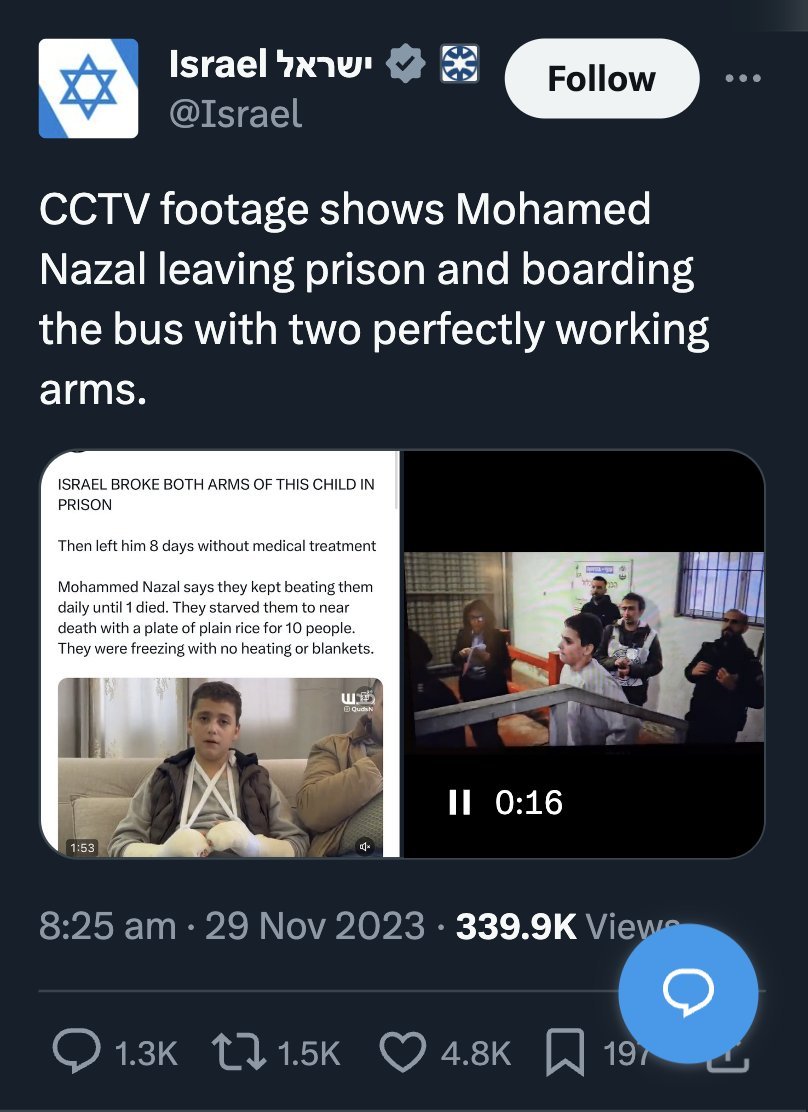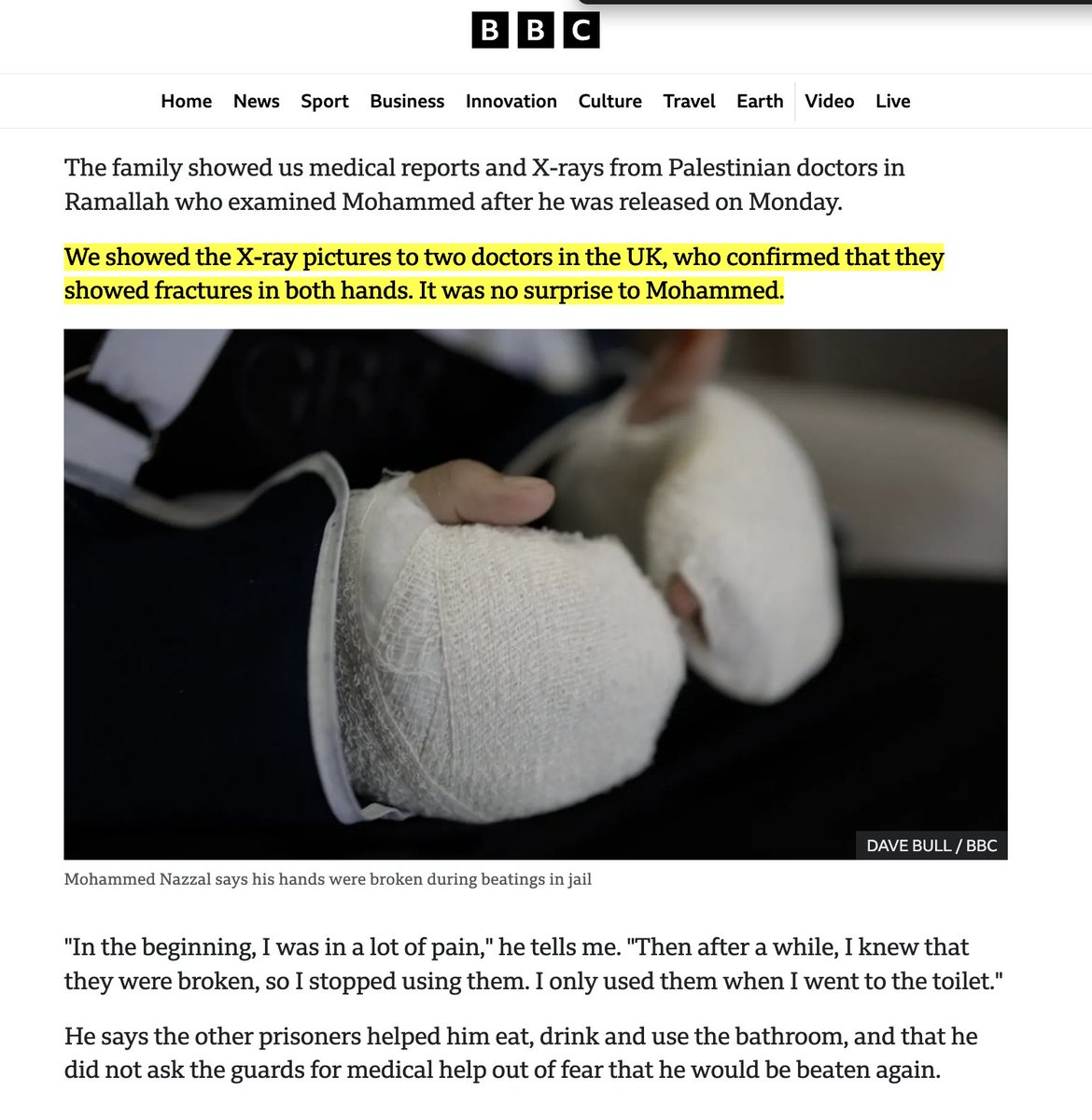 3\ In Nov, Israel lied (again) about Palestinian detainee Mohammed Nazal who was mercilessly beaten & tortured by Israeli prison guards for no reason until they broke his arms & denied him medical treatment. BBC confirmed with 2 UK doctors that his arms were indeed broken. https://t.co/6OTd1oXoK4