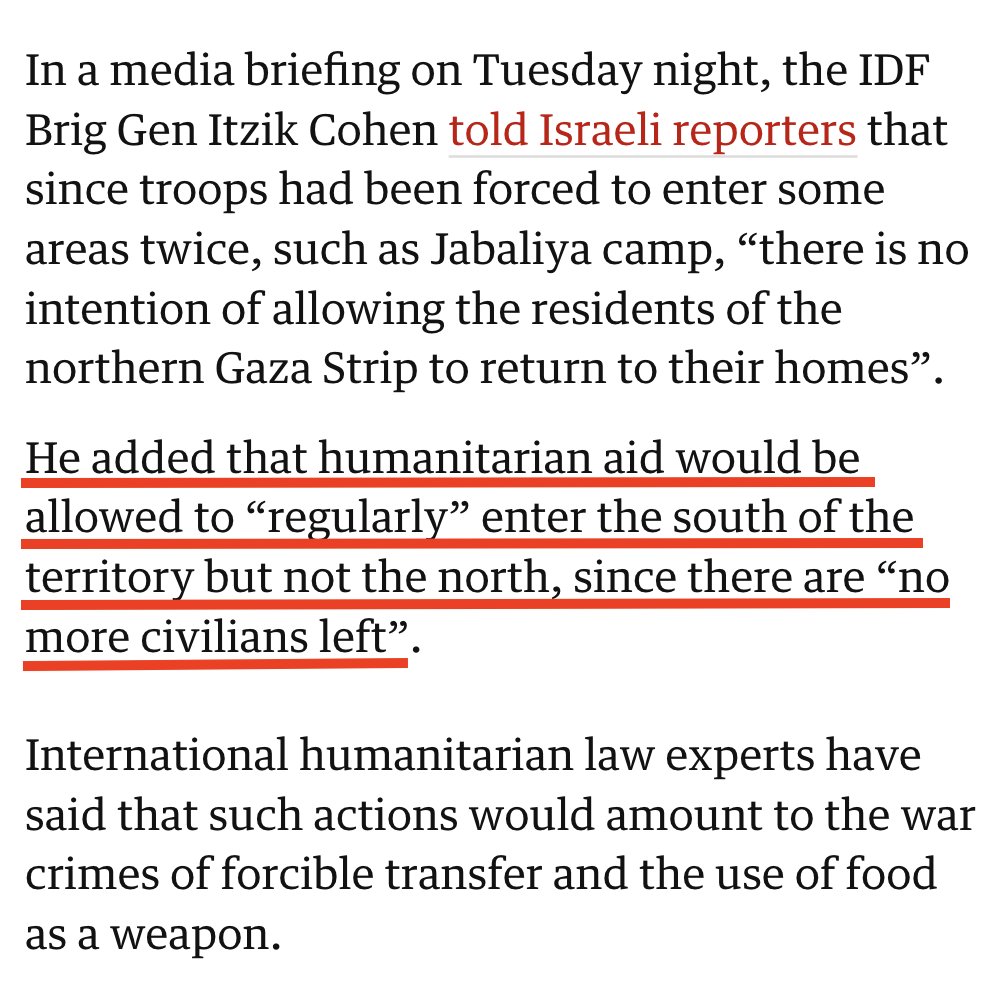 ๐จIsrael officially declares there are NO MORE CIVILIANS in Northern Gaza There is still over 500,000 Gazans there This means Israel now deems every single person left in Gaza city & Jabalia legitimate targets for extermination, starvation, incarceration or forcible expulsion! https://t.co/a7Piqd46NS