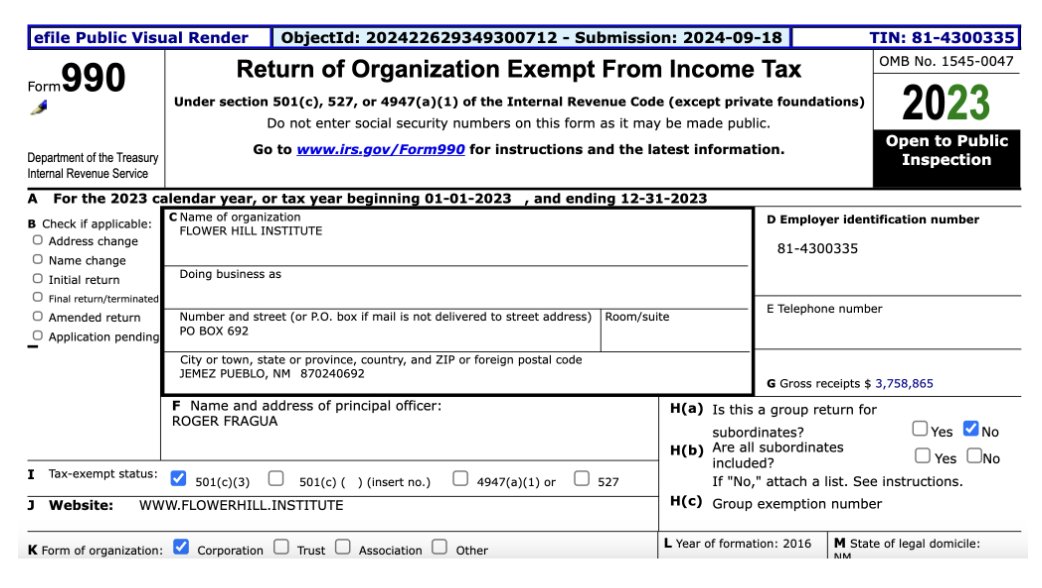 Fragua is also the founder and executive director of the Flower Hill Institute, a charity on tribal land that, in fact, shares a mailing address with the $50 million awardee and Fraguaโs LLC, Cota Holdings.