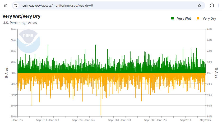 2/12ใU.S. droughts are not worsening. Here's NOAA NCDC's U.S. percentage very wet or very dry: https://www.ncdc.noaa.gov/temp-and-precip/uspa/wet-dry/0 https://sealevel.info/US_percentage_areas_very_wet_or_very_dry_NOAA_2025-01-11.png