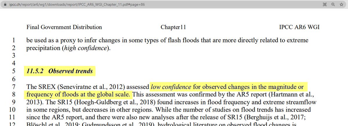 2/6. Even the IPCC acknowledges that climate change has not detectably worsened floods. https://sealevel.info/AR6_says_changes_in_flood_magnitude_or_frequency_undetected03.png In a warming world, the "water cycle" should accelerate slightly, which could be expected to increase overall rainfall, and perhaps floods (and to decrease droughts). But the effect on flooding is so minor that, thus far, it is undetectable, according to the IPCC. Here's an excerpt from their Sixth Assessment Report (WG1, Chapter 11): 11.5.2 Observed trends. The SREX assessed low confidence for observed changes in the magnitude or frequency of floods at the global scale. This assessment was confirmed by the AR5 report. ...