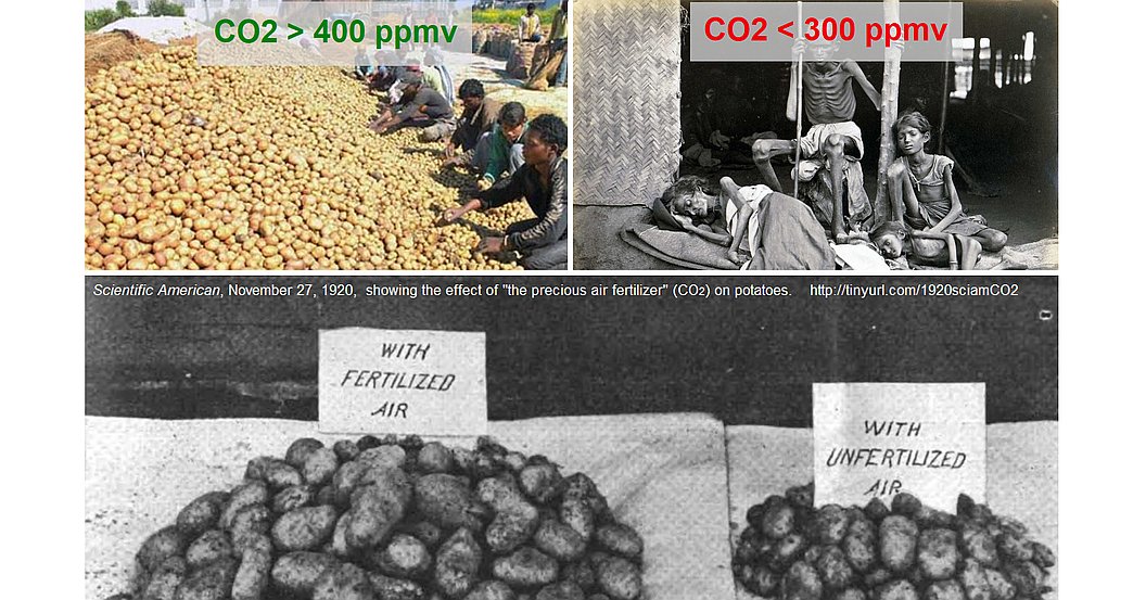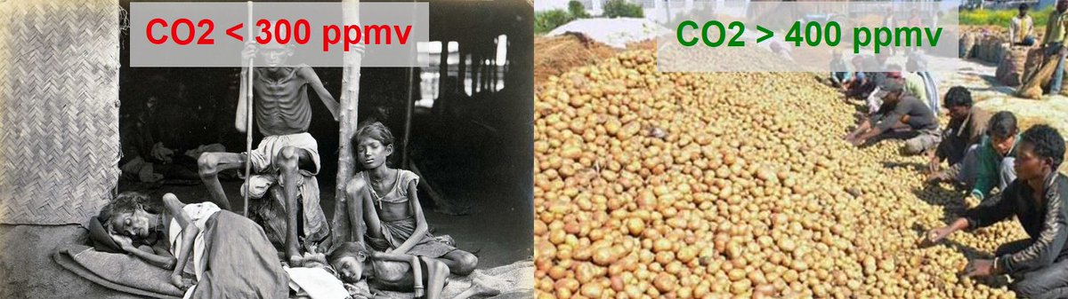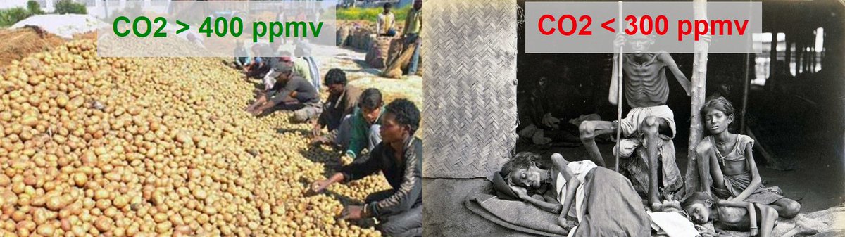 17/18. Rising CO2 levels improve crop yields in two major ways: through "CO2 fertilization," and by improving drought resilience and water use efficiency (WUE). That's long-settled science, among agronomists. Most plants utilize C3 photosynthesis, and agronomy studies show that for C3 crops the CO2 fertilization benefit is highly linear as CO2 levels rise, until above about 1000 ppmv (which is far higher than we could ever hope to drive outdoor CO2 levels by burning fossil fuels). That linearity is obvious in the green (C3) trace, in this graph: https://sealevel.info/C3_and_C4_Pflanze_vs_CO2_Konzentration_1750_1984_2018_2019.png Here's a study about wheat (a C3 crop): https://www.ncbi.nlm.nih.gov/pubmed/26929390 Fitzgerald GJ, et al. (2016) Elevated atmospheric [CO2] can dramatically increase wheat yields in semi-arid environments and buffer against heat waves. Glob Chang Biol. 22(6):2269-84. doi:10.1111/gcb.13263. Plants (and animals) are carbon-based lifeforms. Plants get the carbon they need from CO2 in the air; CO2 is, literally, plant food. The higher the CO2 level, the less air plants must process through their stomata, and the less water they lose in the process (transpiration). Elevated CO2 improves plants' WUE and drought resilience by improving CO2 stomatal conductance relative to transpiration. So eCO2 is especially beneficial in arid regions, and especially beneficial for crops which are under drought stress. Corn (maize) has been very heavily studied. Even though it is a C4 grass (and C4 plants are better at enduring low CO2 levels), corn benefits greatly from elevated CO2, especially under drought stress. Here's a paper: sciencedirect.com/science/articlโฆ Chun et al. (2011). Effect of elevated carbon dioxide and water stress on gas exchange and water use efficiency in corn. Agric For Meteorol 151(3), pp 378-384, ISSN 0168-1923. doi:10.1016/j.agrformet.2010.11.015. EXCERPT: "There have been many studies on the interaction of CO2 and water on plant growth. Under elevated CO2, less water is used to produce each unit of dry matter by reducing stomatal conductance." That improvement is one of several major reasons that catastrophic drought-triggered famines are fading from living memory, for the first time in history. If you're too young to remember huge, devastating, drought-triggered famines, count yourself blessed. Through all of human history, until very recently, famine was one of the great scourges of mankind, the Third Horseman of the Apocalypse. But no more. That is a miracle! Here's the data: https://ourworldindata.org/famines https://sealevel.info/Famine-death-rate-since-1860s-revised-annot1.png Ending famine is a VERYโ Big Deal, comparable to ending war and disease. Compare: โ Covid-19 killed 0.1% of world population. โ 1918 flu pandemic killed about 2%. โ WWII killed 2.7%. โ The near-global drought and famine of 1876-78 killed about 3.7% of the world population. https://sealevel.info/C3_and_C4_Pflanze_vs_CO2_Konzentration_1750_1984_2018_2019.png https://sealevel.info/Famine-death-rate-since-1860s-revised-annot1.png