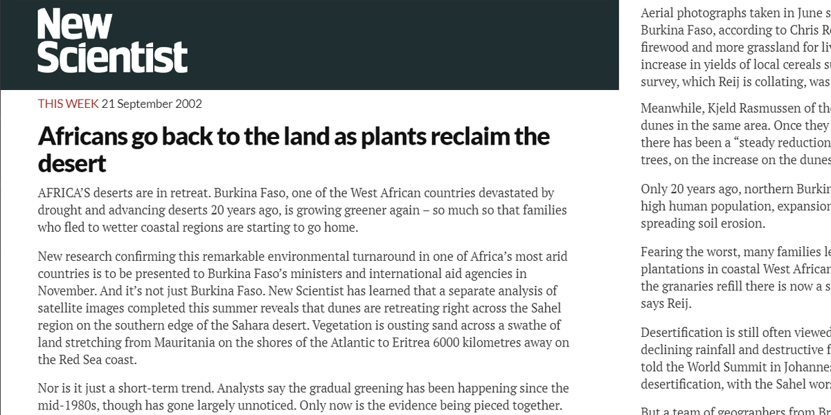 15/18. New Scientist reported the "remarkable environmental turnaround," including "quite spectacular regeneration of vegetation," and "a 70 per cent increase in yields of local cereals such as sorghum and millet in one province in recent years." https://www.newscientist.com/article/mg17523610-300-africans-go-back-to-the-land-as-plants-reclaim-the-desert/ See also: https://www.sealevel.info/Pearce2002_Africans_go_back_to_the_land_as_plants_reclaim_the_desert-New_Scientist.html
