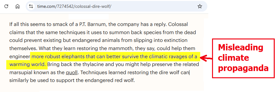 1/18. Interesting story, Jeffrey, but it would've been improved by omitting the climate propaganda: https://time.com/7274542/colossal-dire-wolf/#:~:text=elephants%20that%20can%20better%20survive%20the%20climatic%20ravages%20of%20a%20warming%20worldโฆ "Climatic ravages of a warming world" are the same threat level as unicorn fart pollution.