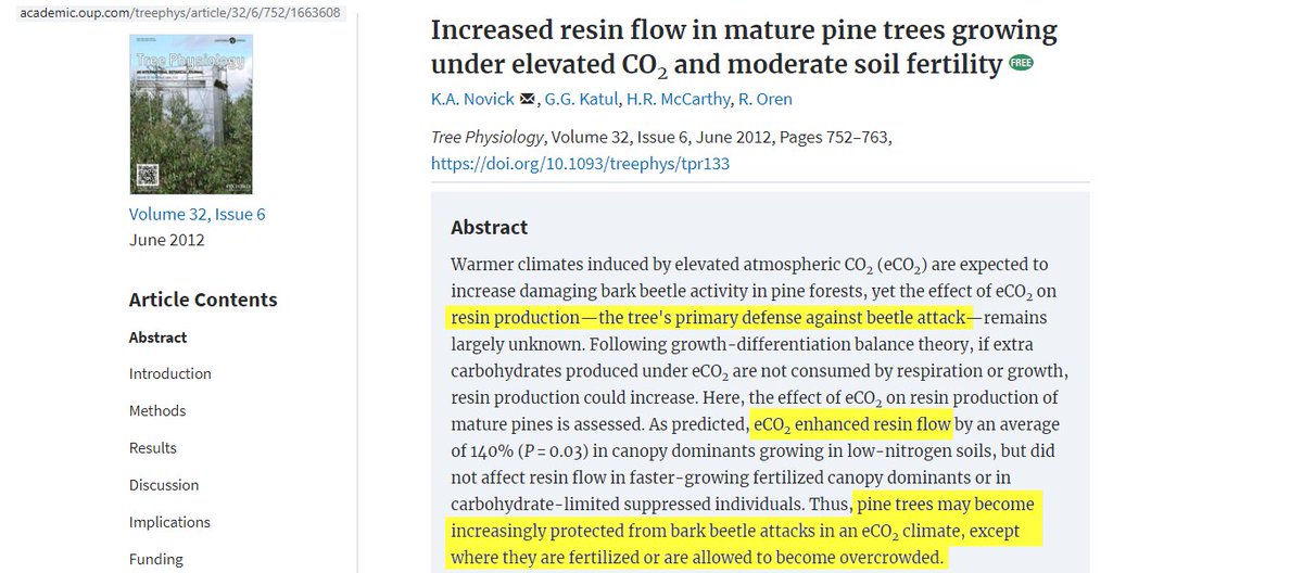@zteirstein 13/18. All of the important effects of CO2 emissions and manmade climate change are positive! Elevated CO2 (eCO2) is beneficial for almost all ecosystems. In fact, eCO2 even helps pine forests withstand bark beetles. https://academic.oup.com/treephys/article/32/6/752/1663608