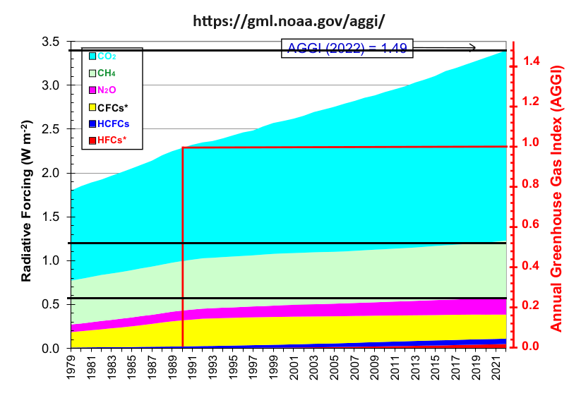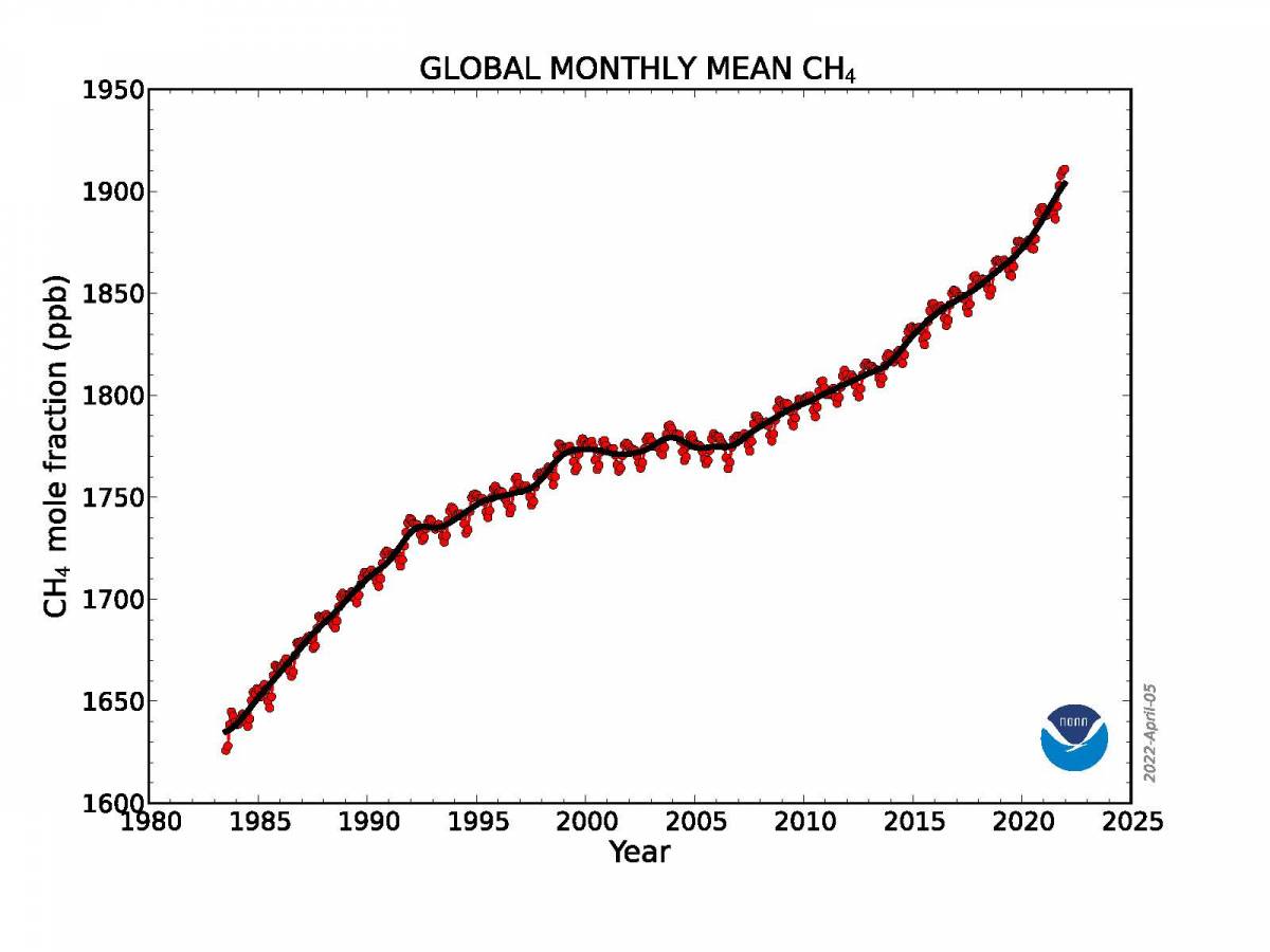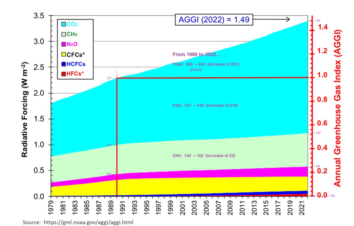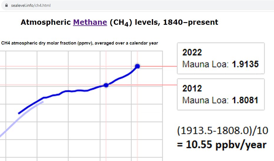 2/4. Here's the CH4 graph: https://sealevel.info/CH4.html https://sealevel.info/CH4_2012-2022_10.55_ppbv_per_yr.png Despite the modest uptick in CH4 level over the last 15 years, the rate of rise in CH4's radiative forcing is still much slower than it was 50-60 years ago. In the 1960s and 1970s the CH4 level rose relatively fast, and consequently CH4 was a larger contributor to radiative forcing increase.