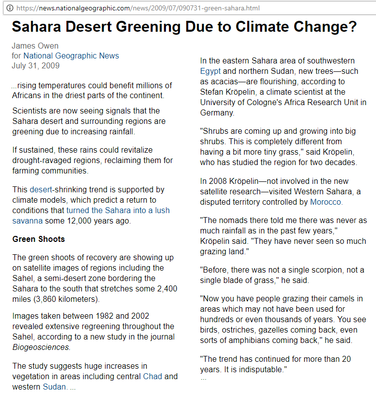 14/18. The impact is especially great for Africa. Even politically correct National Geographic once reported the improvement, back in 2009 (though since then they've scrubbed that good news from their site): https://sealevel.info/Owen2009_Sahara_Desert_Greening-NatGeo30639457.html EXCERPT: "Vast swaths of North Africa are getting noticeably lusher due to warming temperatures, new satellite images show, suggesting a possible boon for people living in the driest part of the continent."