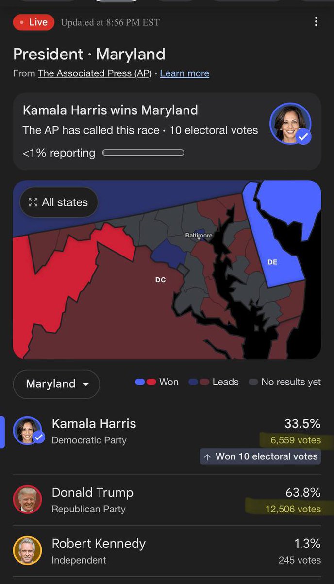 WHAT THE HECKβΌοΈβΌοΈ AP called Maryland for Kamalaβ¦ but their own numbers show Trump has more votesβ¦ at 1% reporting TRUMP IS AHEAD IN MARYLAND AND THEY CALLED IT FOR KAMALAβCHEATINGβΌοΈβΌοΈβΌοΈ #Election2024 https://t.co/ADrnpCffrh