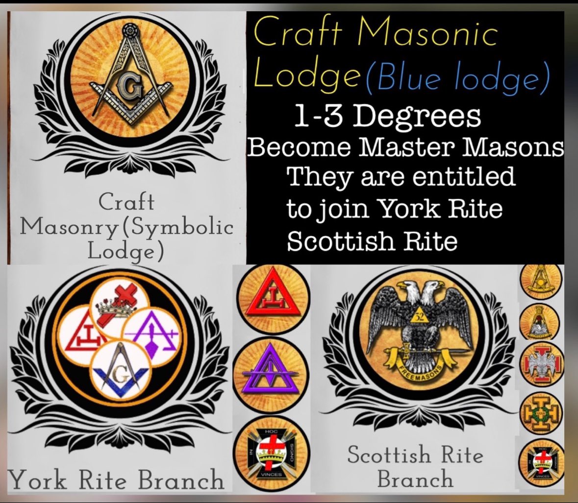 This link gives a basic structure of Free Masonry. The first three steps happen in Craft Mason of Blue Lodge. These steps are : -Apprentice -Fellow Craftsman -Master A Master Mason can join - Scottish Rite - York Rite They can also join social groups like the Order of the Eastern Star or the Shriners . The symbols for the subgroups of Scottish Rite and York Rite is included in this link. https://oriental453.com/Main/structure-of-freemasonry/