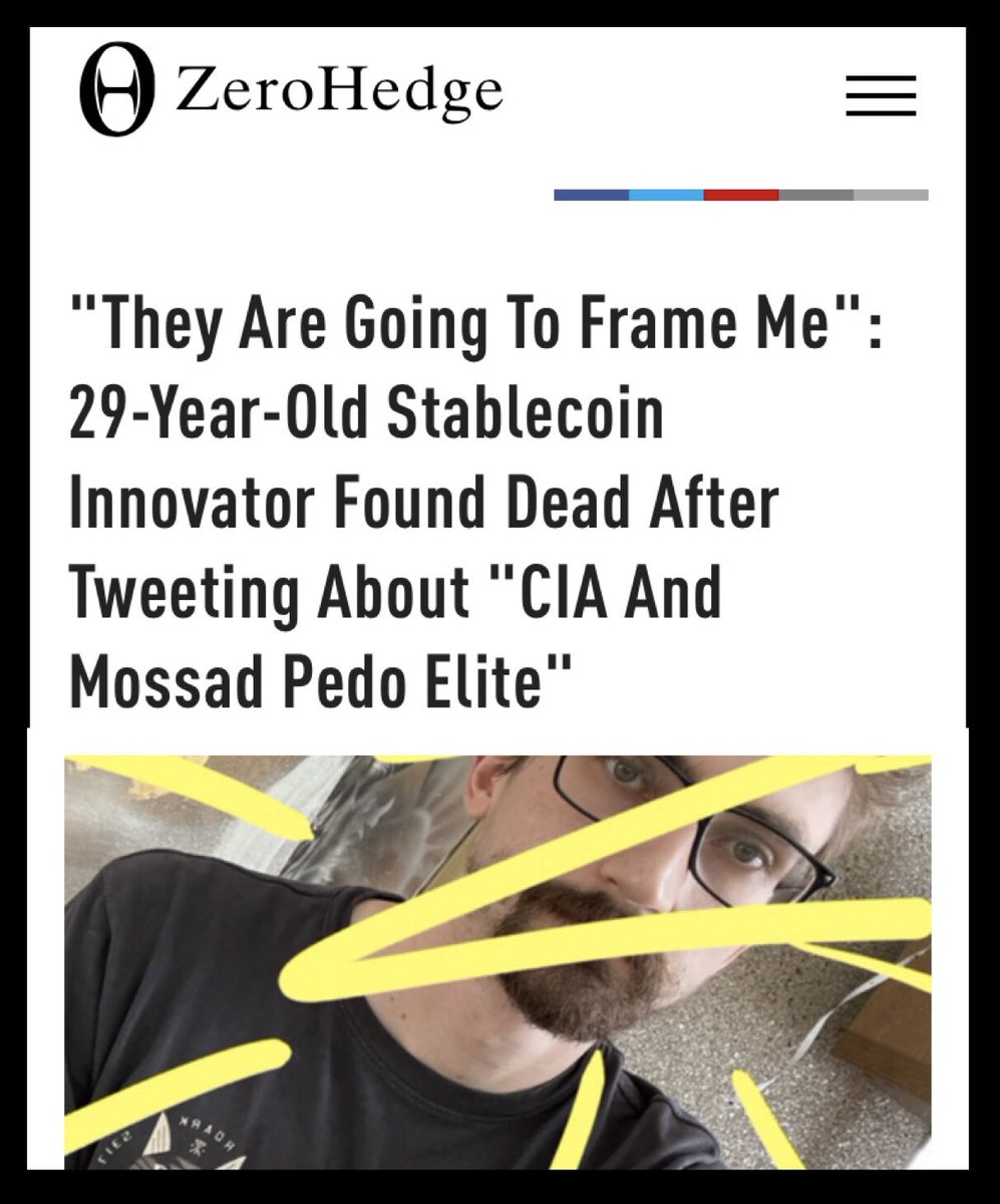 A prominent figure in cryptocurrencies claimed his ex-girlfriend was a spy and thought he might be "suicided by the CIA". He was found dead after tweeting about a "sex trafficking entrapment blackmail ring out of Puerto Rico and caribbean islands." https://www.zerohedge.com/crypto/they-are-going-frame-me-29-year-old-stablecoin-innovator-found-dead-days-after-tweeting