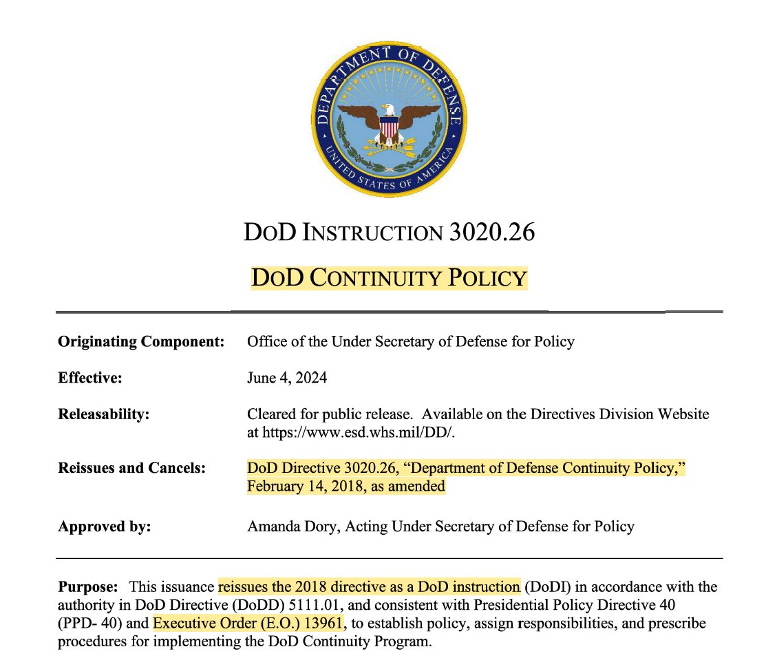 The DoD has updated it's "Continuity Policy" and it sure is interesting. We will be discussing this on tonight's DPH. Make sure you're following us over on @rumblevideo so you don't miss us when we go live! H/T @truestormyjoe for pointing this out.