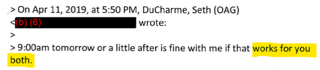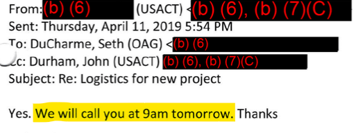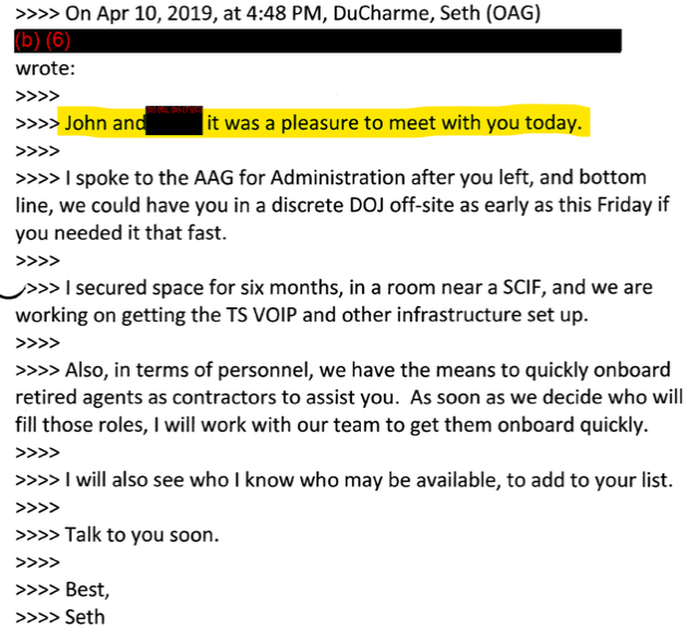 Further emails show Ducharme searching for office space to house the investigation for "John and [redacted] and their team." If John Durham was the one tasked with this probe, why is it being referred to as "their team," and not "John's team" or "Durham's team."