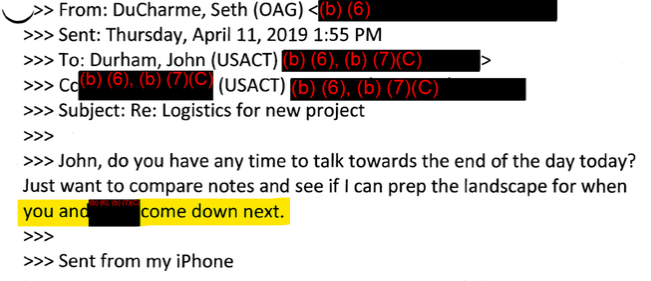 Communications between former AG Bill Barr's aide, Seth Ducharme, and John Durham at the onset of Durham's probe into the origins of the Russia Collusion Hoax reveal that John appeared to be working with another individual to run the investigation. "John and [redacted]"