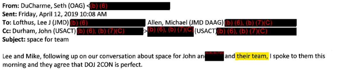I may have found something... 👀 Was John Durham working with a partner? Recently released communications between the Office of AG Barr and Durham reveal another individual who appeared to be jointly working with Durham at the onset of the Russia Collusion Hoax Probe. Thread👇