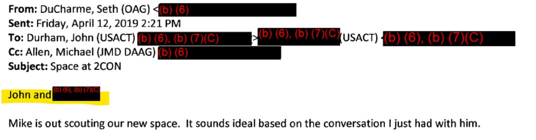 So a few questions. 1. Who is the other individual working with Durham to launch the probe and why is he still redacted? 2. If Durham's investigation has concluded, how can these communications interfere with "enforcement proceedings?" 3. Are 1 and 2 correlated?