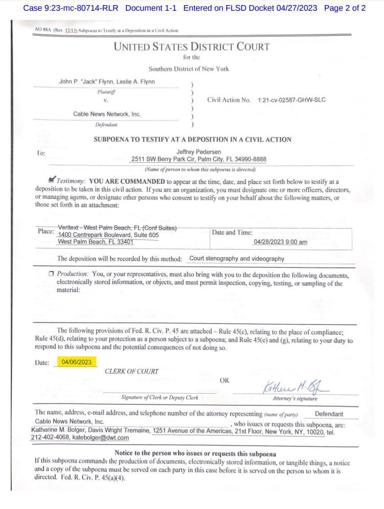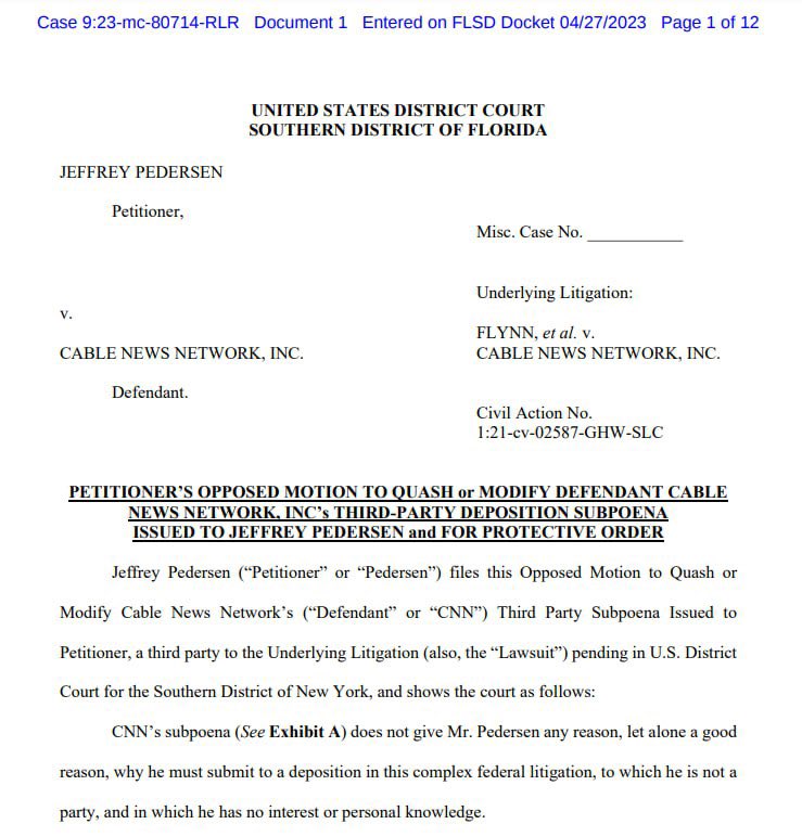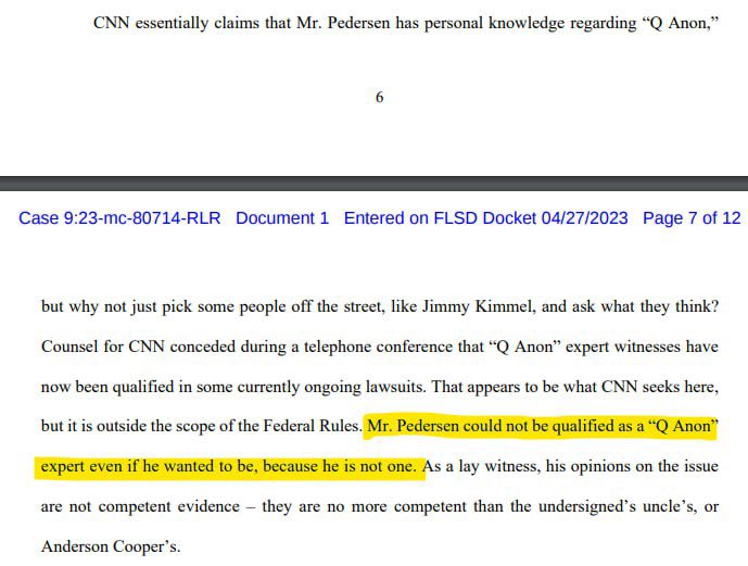 Just to add a little more detail here. He was originally subpoenaed on 4/6/23 Jeff actually sued CNN trying to quash the subpoena. In that motion to quash he admits he isn’t a “Q-Anon expert” which I found funny. In the end he “reached an understanding with CNN,” dropped his suit and agreed to the deposition. Shortly after he started turning on Flynn. Wonder what “understanding” he came to with CNN?