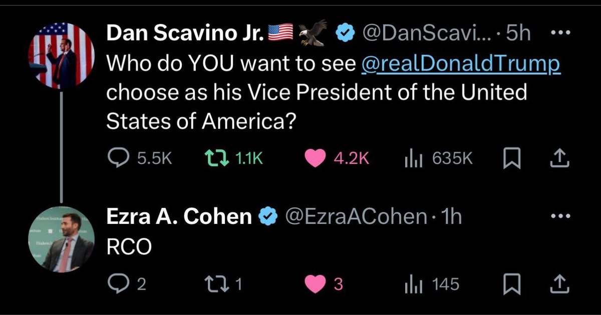 This is interesting... This screenshot was sent to me and it appears Ezra deleted the tweet so I can't personally confirm its authenticity.. Genuine or not, RCO is a very interesting name and one I hadn't considered until now... RCO = Robert C. O'Brien Short Thread 👇