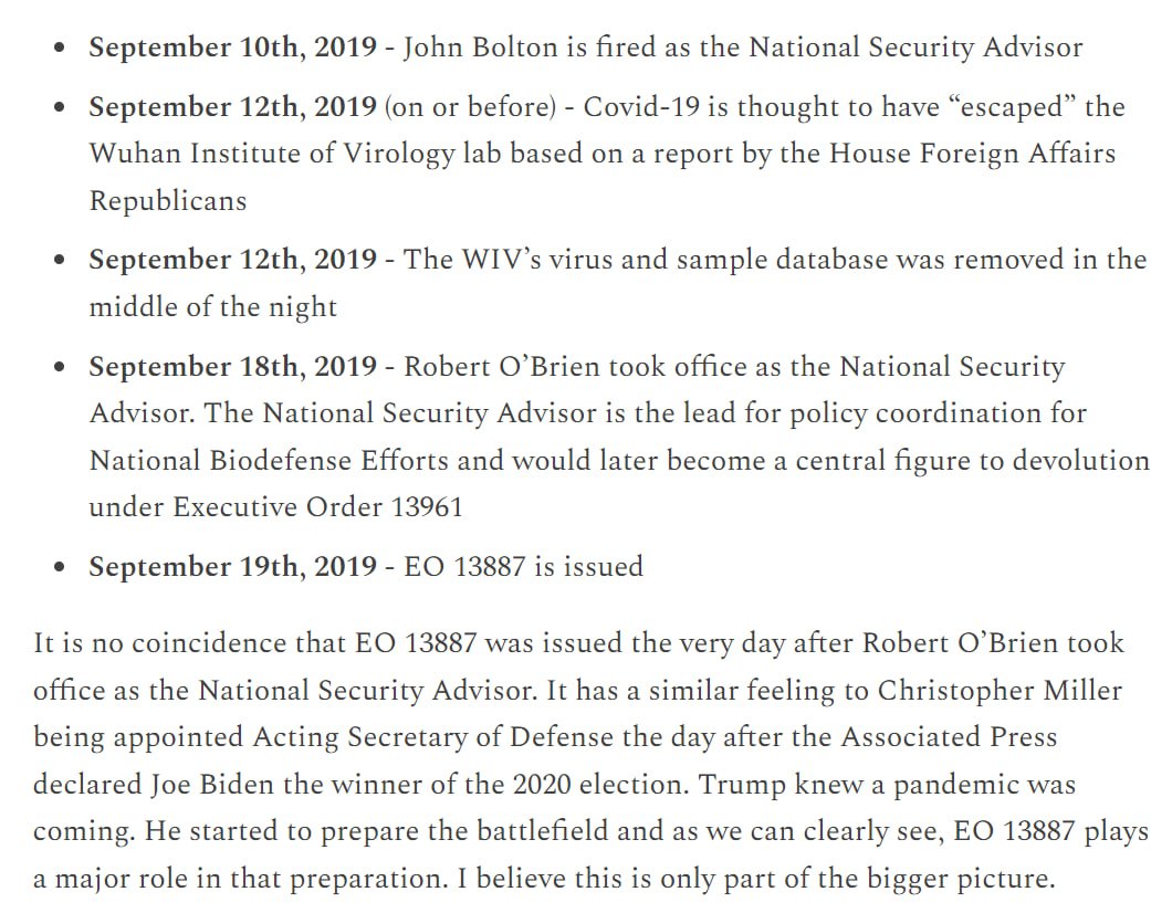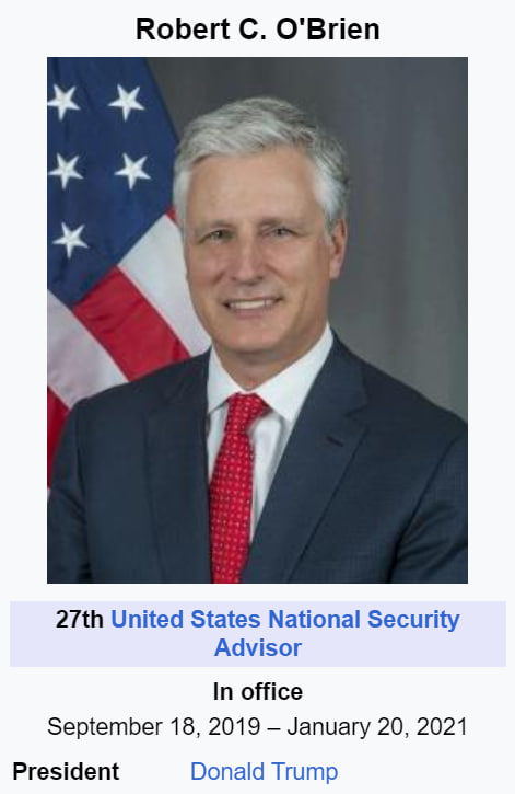 Robert O'Brien is mentioned numerous times throughout my series and we have discussed his role numerous times on the Devolution Power Hour. He replaced John Bolton right around the time Covid was thought to have "escaped" the WIV. Devolution - Part 15