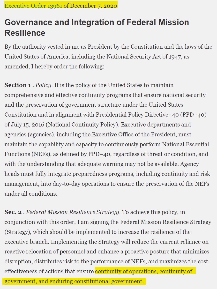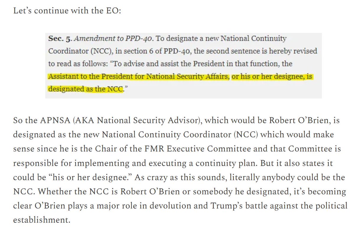 Perhaps most interesting is the role he was given by EO 13961, the EO at the center of the Devolution theory. EO 13961 designated a new National Continuity Coordinator... the APNSA At the time, the APNSA was Robert O'Brien This would be the guy who was in charge of the committee that was facilitating the "execution of the plan and other continuity policy."