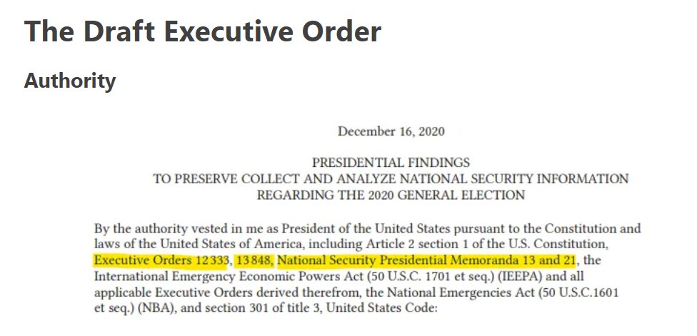 🧵 I want to show you a connection between the newly released Halderman report and what Trump was doing to set up Dev/COG. It has to do with the "Draft Executive Order" that was leaked dated December 16th, 2020 - the one calling for military interdiction in the election.