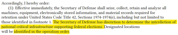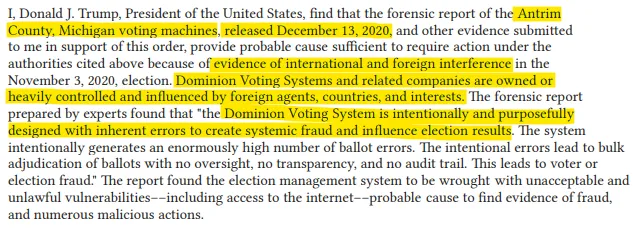 The Draft EO says there is evidence of "foreign interference." He directly mentions Dominion Voting Systems multiple times. "The Dominion Voting System is intentionally and purposefully designed with inherent errors to create systemic fraud and influence election results."
