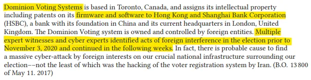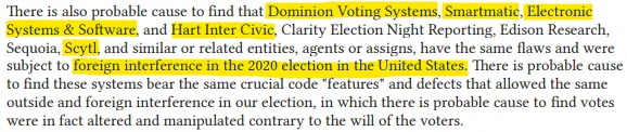 It stated that the systems had "crucial code "features" and defects that allowed the same outside and foreign interference in our election, in which there is probable cause to find votes were in fact altered and manipulated contrary to the will of the voters."