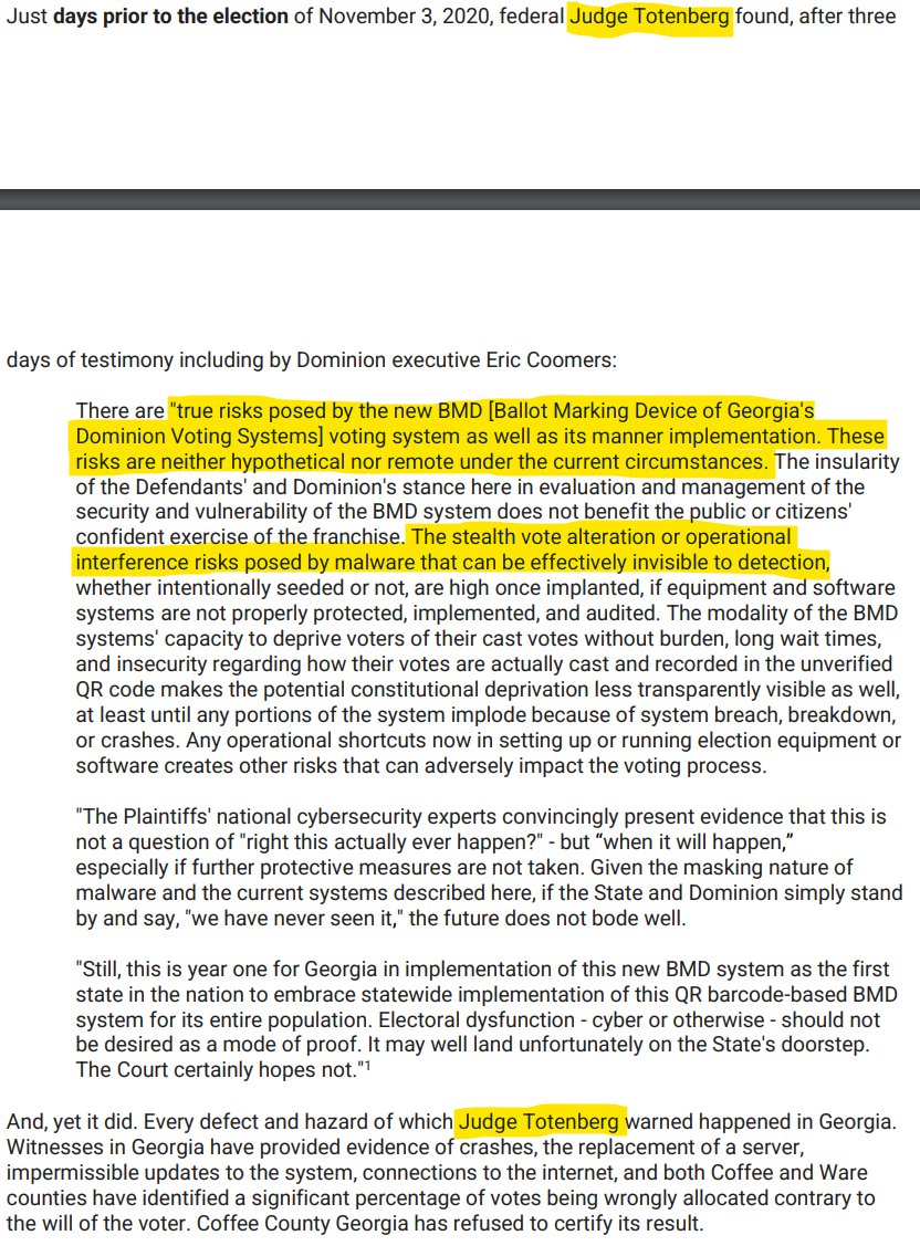 The Draft EO happens to cite the one court case, out of maybe 100s or 1000s of court cases surrounding election fraud, that years later unseals a report detailing that Dominion machines could allow manipulation of votes without detection, just as the EO stated. Dasting...