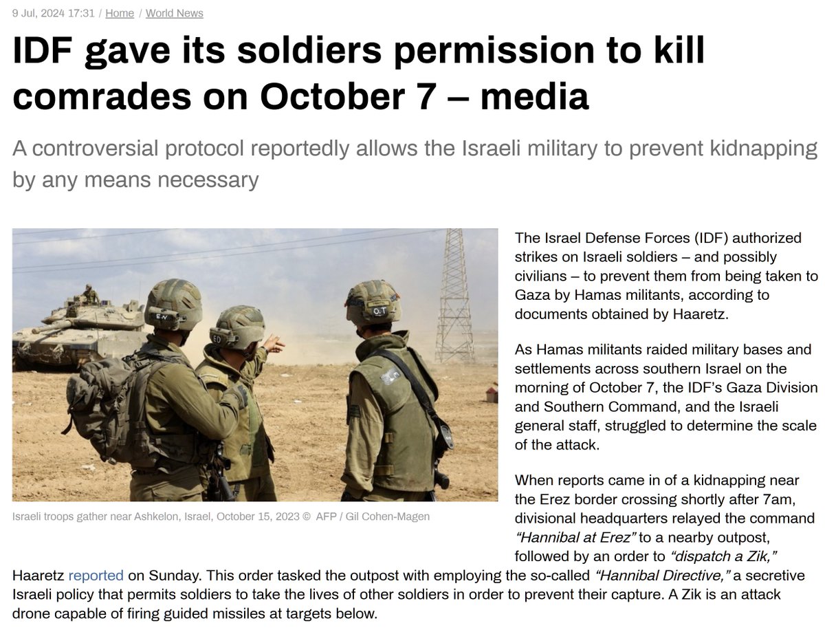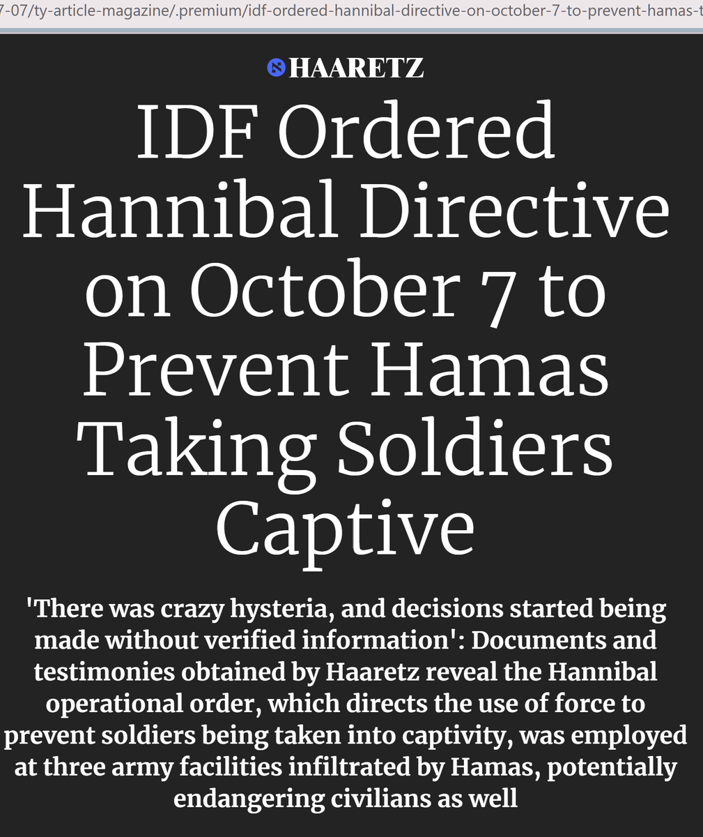 In mijn debat bij @cafeweltschmerz met twee zeer slecht geïnformeerde 'christenen voor Israël' werd getwijfeld aan mijn uitspraak dat Israël op 10/7 het zogenaamde Hannibal-directive had geactiveerd. Ze hadden er nog nooit van gehoord en dus was het volgens hen onzin. Dan ben je geen serieuze gesprekspartner omdat je dan om een groot deel van de verslaggeving hebt heen gelezen. In deze draad laat ik zien dat ook mainstream media er gewoon openlijk over rapporteerden. Om te voorkomen dat er levende gijzelaars konden worden gemaakt, heeft het IDF ook de eigen mensen afgemaakt. De meeste slachtoffers op 10/7 werden gemaakt door de IDF Apache helicopters die af en aan vlogen. cc @Shohrehfeshtali