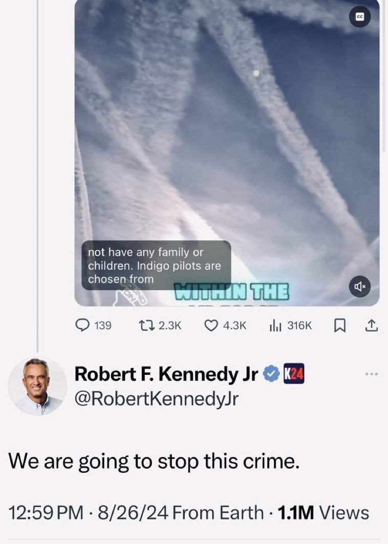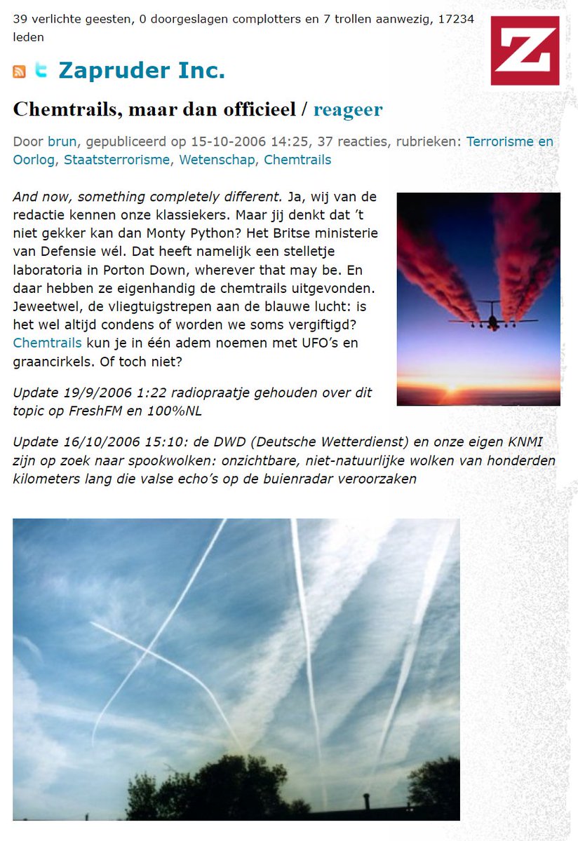 Het zijn geen chemtrails maar 'opzettelijke' contrails. Bewuste geo-engineering. Jim Lee vertelt in dit fragment dat de ruitpatronen en kunstmatige bewolking aan de hemel (in de VS) geen chemtrails zijn maar normale contrails die met Google AI en andere software opzettelijk worden gelegd in een specifiek patroon, door de lijnvluchten door de juiste luchtlagen en over de juiste routes te sturen. Dit klinkt veel plausibeler dan chemtrailing door lijnvluchten. Ze kunnen kennelijk ook de contrail-generatie enigszins veranderen met soorten brandstof. Dus geen speciale sproei-installaties. Geen vliegtuigen vol chemtrail tanks. Geen piloten die op knopjes drukken. Geen giftige additieven. Geo-engineering met normale contrails. Dit is goed nieuws want het betekent ook dat we vluchten kunnen rerouten zodat ze MINDER contrails produceren. Daar moeten wij ze toe gaan dwingen. Dit verklaart ook heel goed dat het chemtrailing narratief een opzettelijke psyop kan zijn. Poison the well. Door het verhaal van strepen aan de lucht zo belachelijk te maken, wordt het echte complot (contrail geoengineering) ook onbespreekbaar gemaakt. CC @dancalegria @thierrybaudet @AndereKrant Uit deze docu: https://thehighwire.com/ark-videos/unpacking-climate-engineering-with-jim-lee/ Zie ook: https://snexplores.org/article/how-to-curb-the-climate-heating-by-contrails