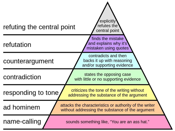Drogredeneren Waar cognitieve vertekening vooral het bevooroordeeld selecteren van feiten betreft, is drogredeneren vooral het onzinnig verbinden van feiten. Logische drogredenen zijn gebrekkige, misleidende of onjuiste redeneringen. Drogredeneringen worden zowel onbewust als bewust gemaakt. In dat laatste geval is het om discussies te saboteren of om mensen te misleiden. Iedereen zal dat herkennen van sociale media. Bekende drogredeneringen zijn: - De Ad Hominem ofwel de persoonlijke aanval is een niet-inhoudelijk argument gericht tegen de persoon om diens argument ongeloofwaardig te maken; - De stroman is een misleiding door niet het oorspronkelijke argument aan te vallen maar een ander daarop lijkend argument om de illusie van weerlegging te creëeren; - Het vals dilemma is de mogelijke conclusies van een stelling bewust te beperken tot een verzameling waarvan de (juiste) conclusie is uitgesloten. Is de mensen geschapen door God of Darwinistisch geëvolueerd? Dit is een vals dilemma omdat ook intelligent design of combinaties kunnen worden overwogen. Misschien is de mens zelfs een programma een in simulatie; - De overhaaste generalisatie is het tot algemeen geldig verklaren van anekdotisch bewijs. Eén zwaluw maakt nog geen zomer; - De onjuiste oorzaak-gevolgrelatie doet alsof er causaliteit bestaat die er niet is. Dat bij veel botsingen glasscherven op straat liggen, wil niet zeggen dat de glasscherven de oorzaak zijn van veel botsingen. Het bekende ‘correlatie is nog geen causaliteit’; - In een cirkelredenering wordt eigenlijk helemaal geen nieuw argument gegeven, maar wordt hetzelfde argument op een andere manier herhaald. Voorbeeld: ‘Ik vind vrijheid van meningsuiting erg belangrijk, omdat ik vind dat iedereen moet kunnen zeggen wat hij of zij denkt’; - Het vertekenen van het standpunt komt neer op van het woorden in de mond leggen van de discussiepartner. Voorbeeld: Man: Ik vind vrouwen soms erg snel geïrriteerd. Vrouw: Dus jij vindt dat ik snel geïrriteerd ben? Drogredeneringen onschadelijk maken, is een kwestie van zuiver blijven discussiëren over het oorspronkelijke argument. Een middel dat kan helpen bij het voeren van zinvolle discussie is Graham’s Hierarchy of Disagreement . Hoe lager in de piramide, hoe minder zinvol een argument is.