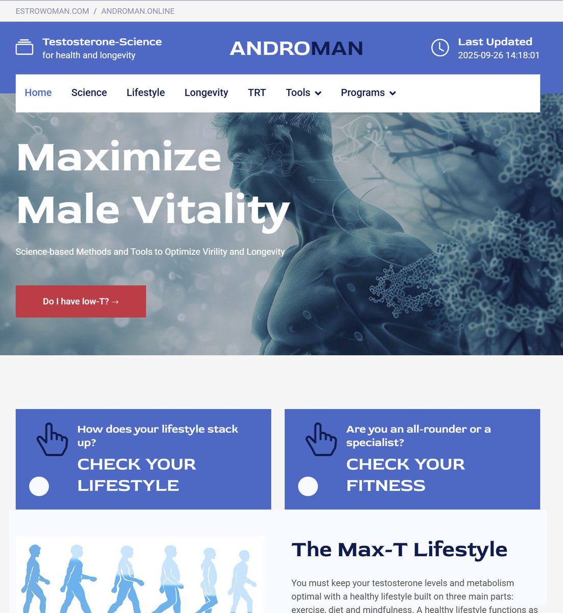 Mannen! Mijn Androman-site is af. Vergeet dat wetenschapsgeneuzel, de podcasts, preventieve geneeskunde, genetische markers, bloedwaarden en influencer-bazel. Het is allemaal wellicht wel waar, maar niet waar het echt om zou moeten gaan. DIT WEL -> https://androman.online Vrouwen: er komt ook een Estrowoman-site.