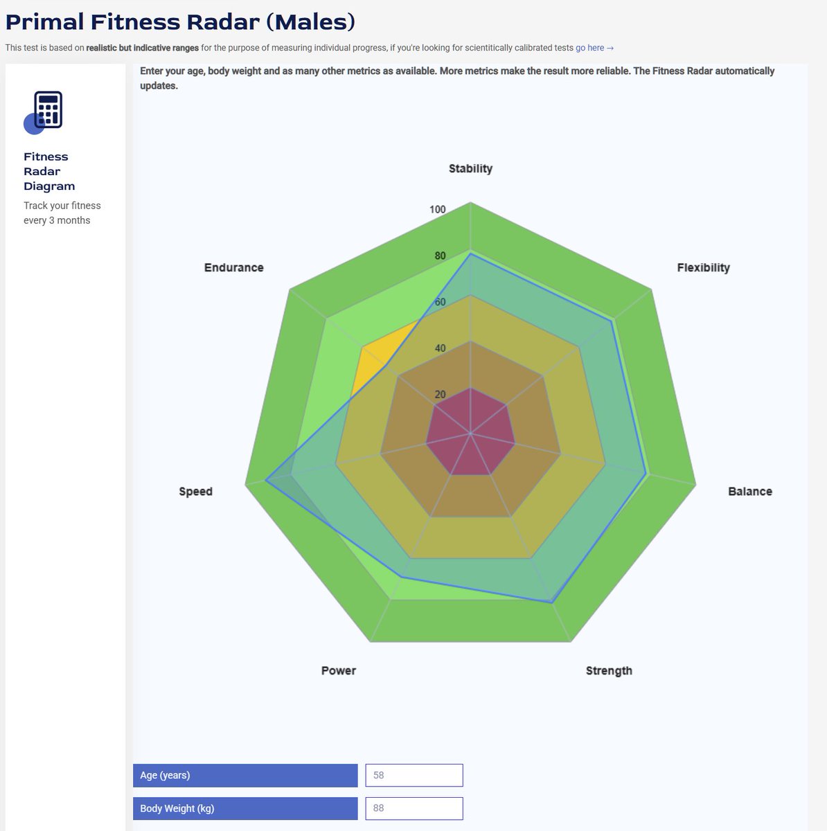 Trainen hoeft ook niet moeilijk te zijn. 3x/week training brengt voldoende gezondheid en langlevendheid om vrijwel alle slechte gewoontes te neutraliseren. Maar wat moet je allemaal doen? Ik heb een prachtige fitheidsradar geprogrammeerd -> https://androman.online/train#fitcalculator