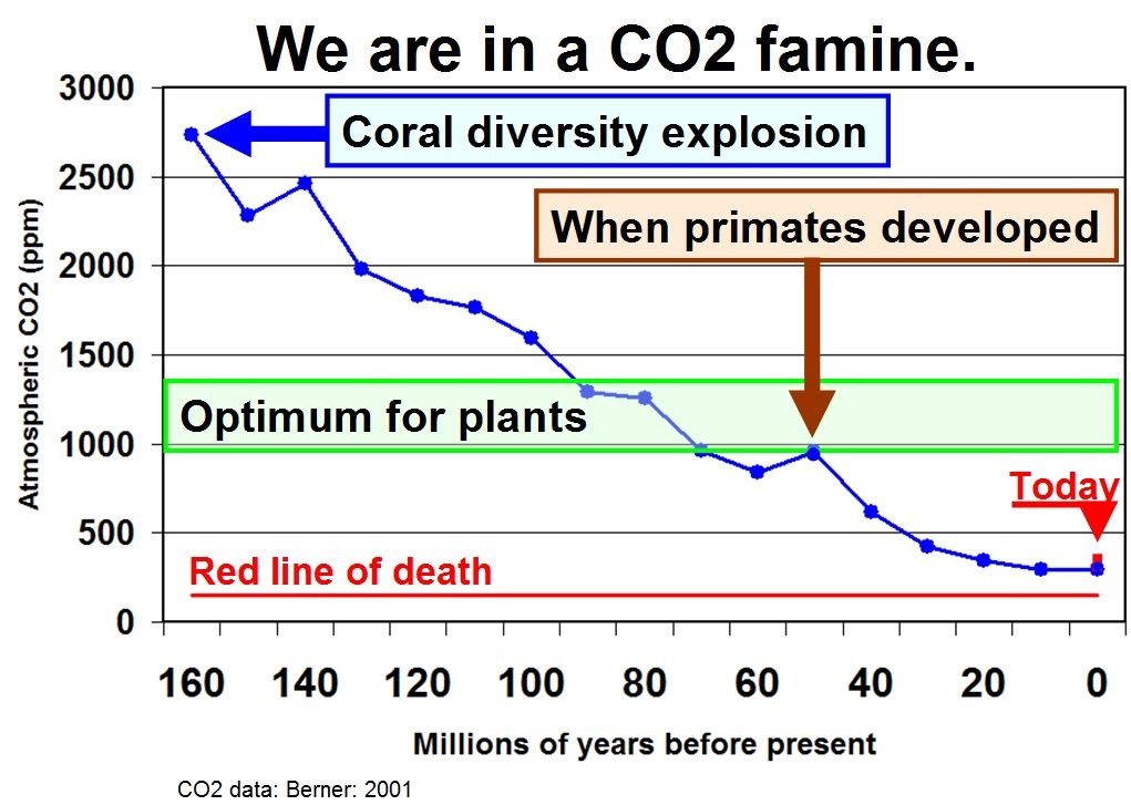 Het huidige atmosferische CO2 niveau van 420ppm is net boven extinction level. Voor een mooie groene biodiverse planeet die meer dan 8B mensen kan onderhouden, is een veel hoger niveau nodig. Minimaal 2x zo hoog. Alleen een anti humane agenda zou pleiten voor lagere CO2. Bijvoorbeeld een depopulatie-agenda.