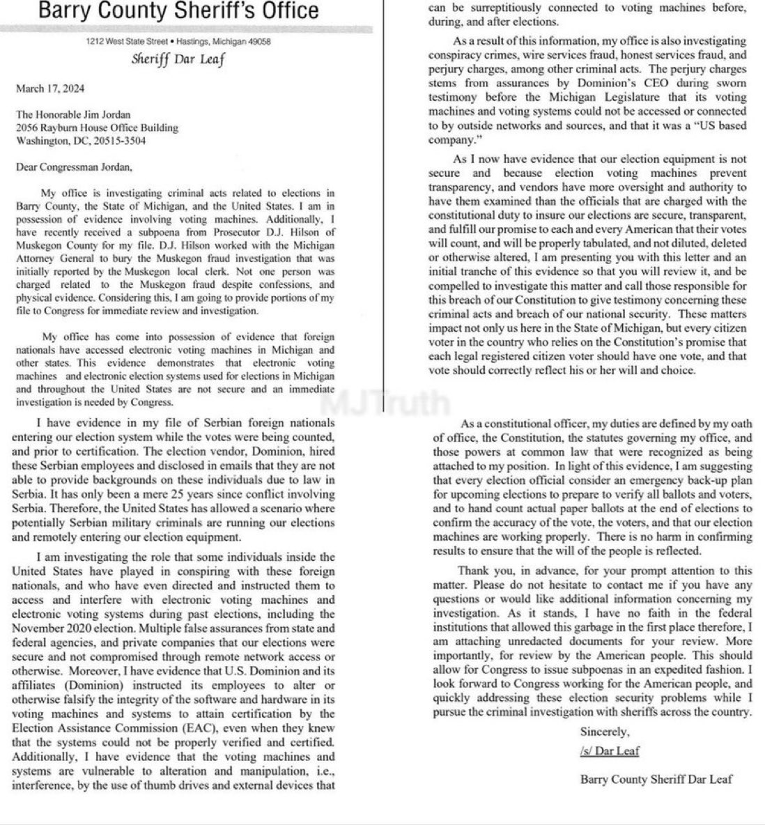 Constitutional @SheriffLeaf is the source of the Dominion internal communications showing how foreign nationals from Serbia and Canada have central roles in the execution of American elections. In his letter to @Jim_Jordan, he cites his loss of faith in federal institutions as his reason for posting the files. He believes that all Americans should have the opportunity review this information as he continues his criminal investigations into America's election security problems. In his release, Dar exposes the lies we have been fed about the security of our elections in the wake of the #2020Election. If only other members of our law enforcement community would have the conviction needed to honor their oaths of office and defend our constitution as Dar has. https://drive.google.com/drive/folders/1c_xO_dLXtj8ZSL18ggobn5lwHF5CbIAo?usp=sharing @realMikeLindell @TruckerRandy @TomJordanNews @MrJustinBarclay @IllinoisReview @gatewaypundit