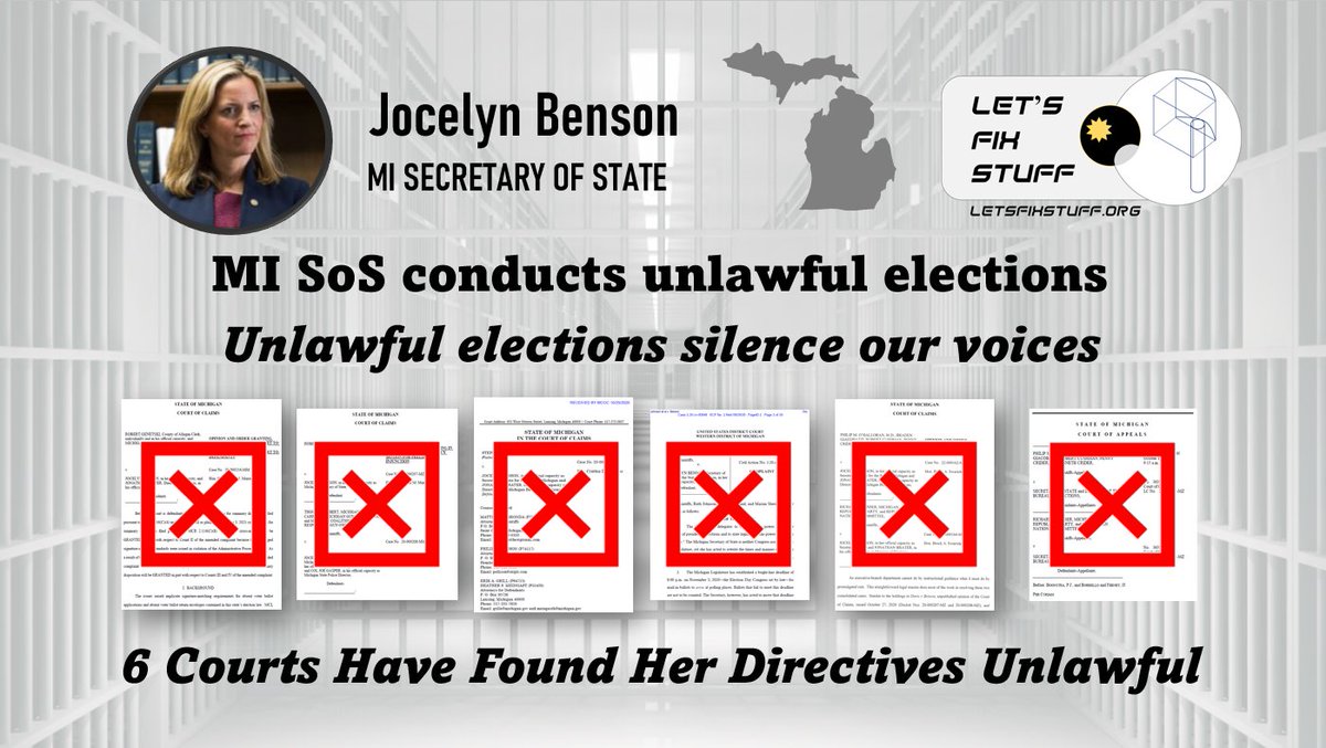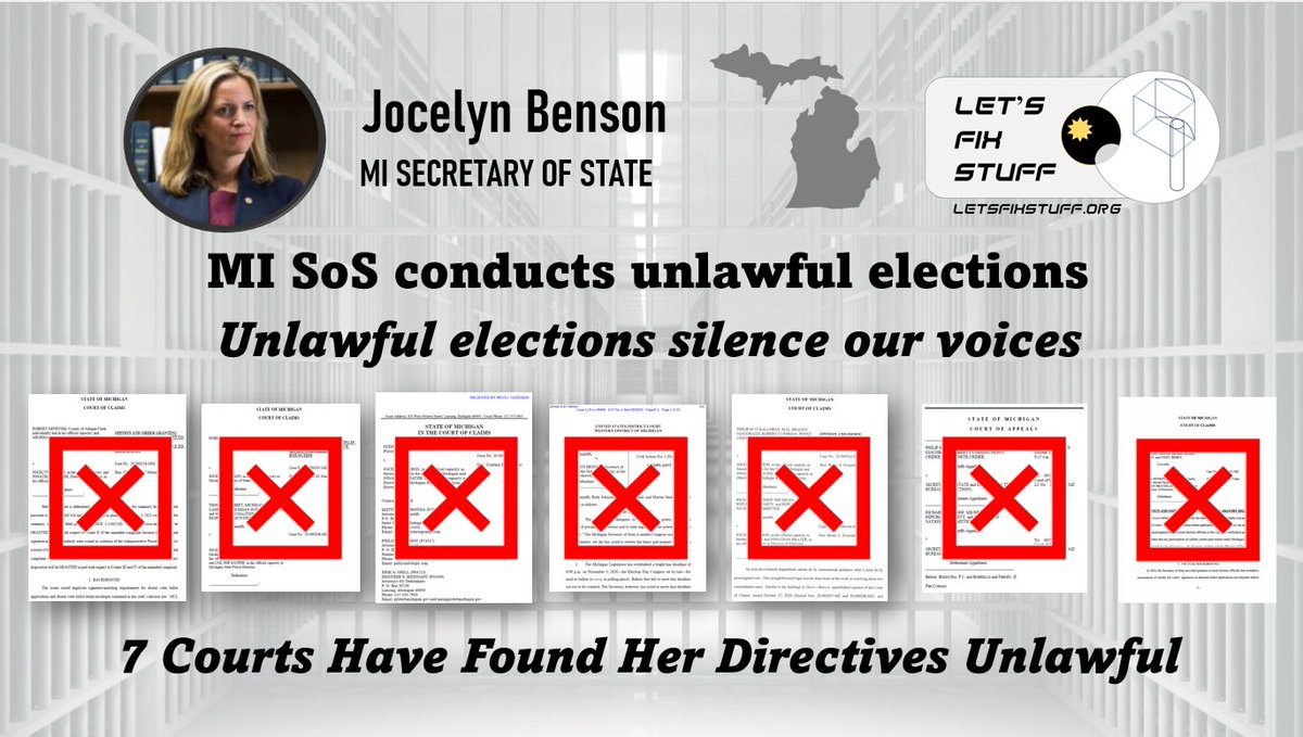REMINDER: SIX separate courts have found that MI SoS @JocelynBenson issued unlawful directives to MI election officials pertaining to the conduct of the 2020 and 2022 elections. Don't believe anyone who asserts that we have not proven our case that these elections have been conducted in an unlawful manner. We have. Now we need Benson to be held accountable for these actions...plus many others which have not yet made their way into lawsuits such as her unlawful orders to destroy election records. @MrJustinBarclay @DarrylWoodShow @TruckerRandy @stevegrubershow @TuckerCarlson @BobDutko @danbonginoknows @TomJordanNews