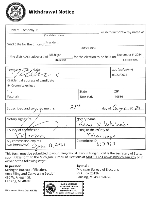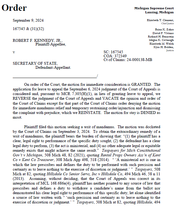 In a 3-0 decision by the MI Court of Appeals, RFK Jr name is to be taken off the #2024Election ballot. MI SoS @JocelynBenson used MCL 168.686a(4) as basis of keeping RFK Jr on the ballot against his wishes. Under this section of law, candidates are not allowed to withdraw. It turns out that MCL 168.686 is the governing statute for presidential candidates. Under this section of law, there are no such prohibitions upon withdrawal. That makes NINE losses in court for the former Dean of the Wayne State University Law School whose legal counsel has admitted to her having contempt for the law. https://www.courts.michigan.gov/4a4ff9/siteassets/case-documents/uploads/opinions/final/coa/20240906_c372349_28_372349.opn.pdf @MrJustinBarclay @TomJordanNews @TruckerRandy