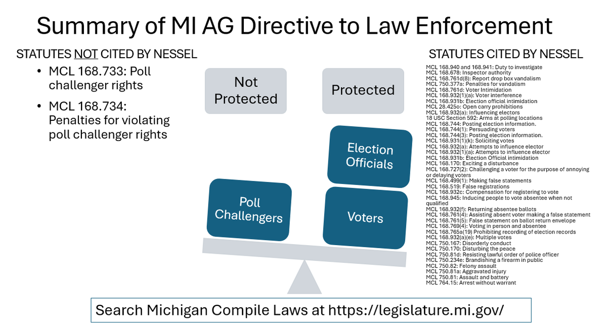 MI AG @dananessel has deliberately teed up conflict at election sites with her biased directive to law enforcement regarding which statutes to enforce regarding elections. She completely IGNORED the rights of poll challengers. Poll challengers attempting to assert those rights will likely be arrested by law enforcement officers operating under Nessel's directive. Yet another blatant attempt by Democrats to prevent oversight of Michigan elections and stir up conflict by targeting law-abiding citizens. Another name for this behavior is #ElectionInterference. @elonmusk @MrJustinBarclay @DC_Draino @EmeraldRobinson @TruckerRandy @MIGOP @GOP @laralogan @SharylAttkisson @gatewaypundit @EpochTimes @charliekirk11 @Charlieleduff @Franklin_Graham @realLizUSA @christina_bobb @prayingmedic @BehizyTweets @CannConActual @dbongino @realDonaldTrump