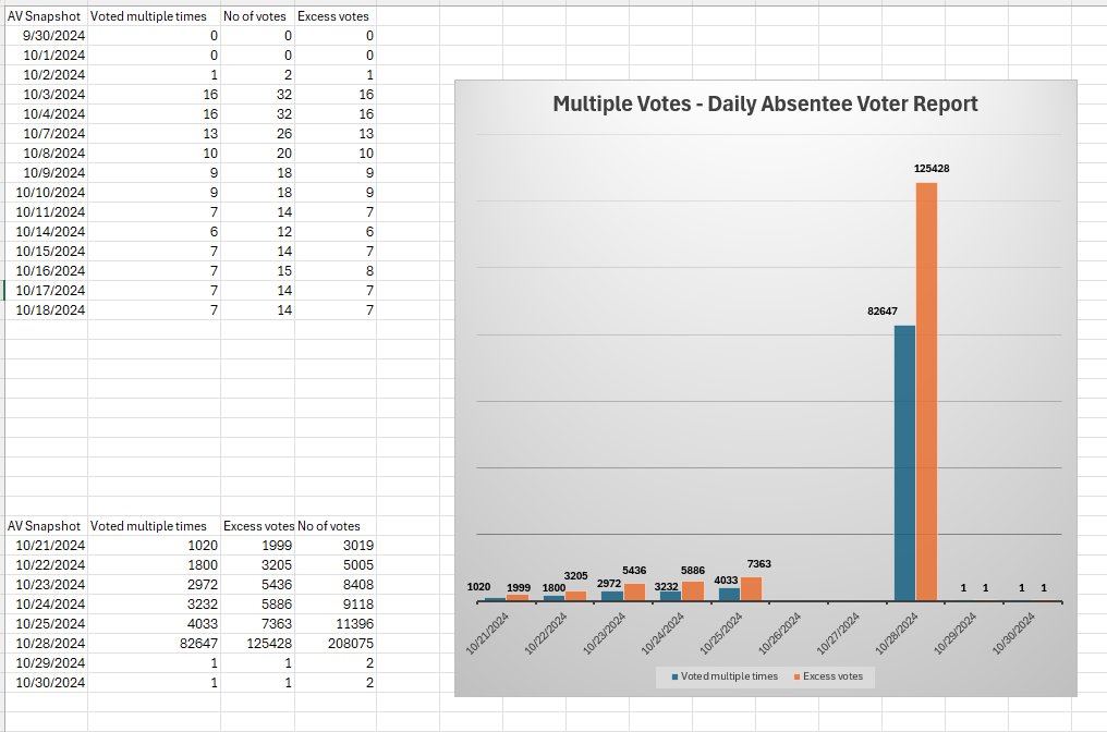 Lara, did you ask MI SoS why the supposed report query "glitch" did not seem evident from 9/30/24 to 10/18/24? Then the number of multiple votes jumped up on 10/21/24? Then it jumped again on 10/28/24? Sorry. I don't believe that the report query was changed from day to day. MI SoS @JocelynBenson needs to "show us all her math". 1) Show report query in effect from 9/30/24 to 10/18/24 2) Show report query in effect from 10/21/24 to 10/27/24 3) Show report query in effect on 10/28/24 4) Show report query in effect on 10/29/24 and 10/30/24 5) Show MI Qualified Voter File (QVF) transaction log (who, when, what) I still remember when Benson tried to pass off 7,060 vote flip in Antrim as a "clerical error". In the words of Ronald Reagan, trust but verify ;) @elonmusk @mdeperno @dbongino @realMikeLindell @DeluxePsypher @timlovesann @EmeraldRobinson @MrJustinBarclay @TruckerRandy @realLizUSA @pnjaban