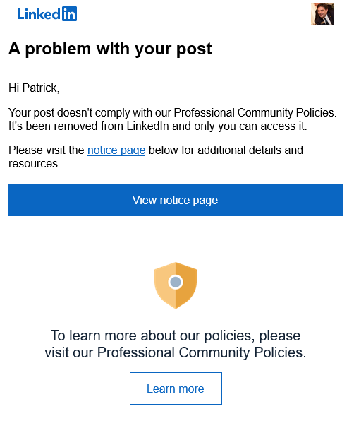CENSORSHIP: LinkedIn sent me this love letter yesterday regarding my post on Dominion ICX machines being caught flipping votes in GA. My appeal of their censorship was rejected instantaneously (i.e. automated...you know, like the machine-based vote flipping in GA). @BehizyTweets @mtgreenee @elonmusk