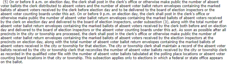Why would MI Democrats like @GovWhitmer @SenPolehanki and @RanjeevPuri vote to remove the requirement for clerks to publicly post the number of absentee ballots received by 9pm on election day? The most reasonable explanation is that they seek to avoid "constraints" on the number of illegal absentee ballots that can be stuffed into ballot box in the wee hours of the night such as the 3:30am drop of thousands of ballots in Detroit without any chain of custody in 2020. NOTE: New statute in link. Snapshot of previous statute attached. https://legislature.mi.gov/Laws/MCL?objectName=mcl-168-765
