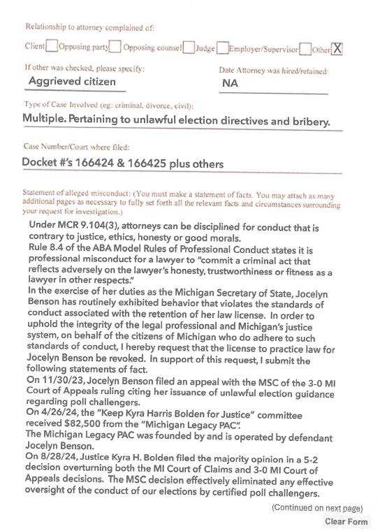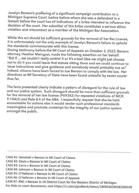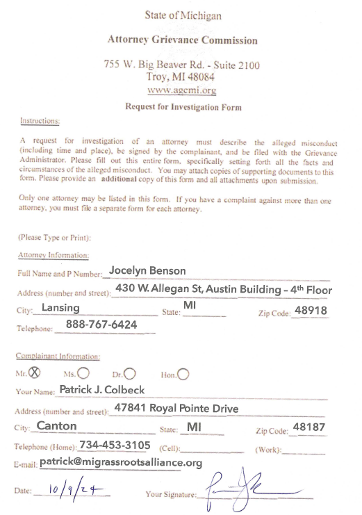 BREAKING: Today, I filed a Request for an Investigation of MI SoS @JocelynBenson by the Michigan Attorney Grievance Commission for violation of the ethical standards tied to her possession of a Michigan Bar License. The allegations in my request include bribery of a MI Supreme Court Justice and a demonstrable pattern of contempt for the rule of law. @MIGOP @GOP @MrJustinBarclay @TomJordanNews @stevegrubershow @TruckerRandy @laralogan @SharylAttkisson @DC_Draino