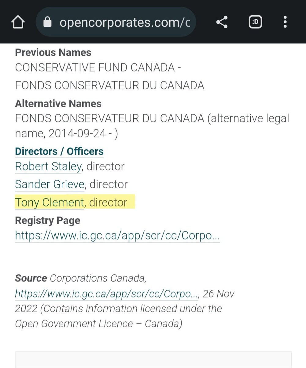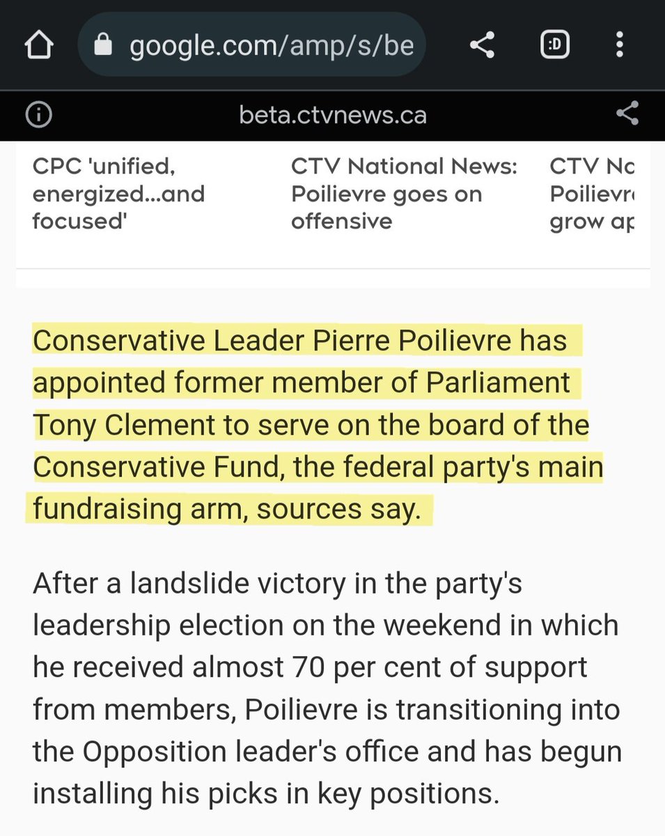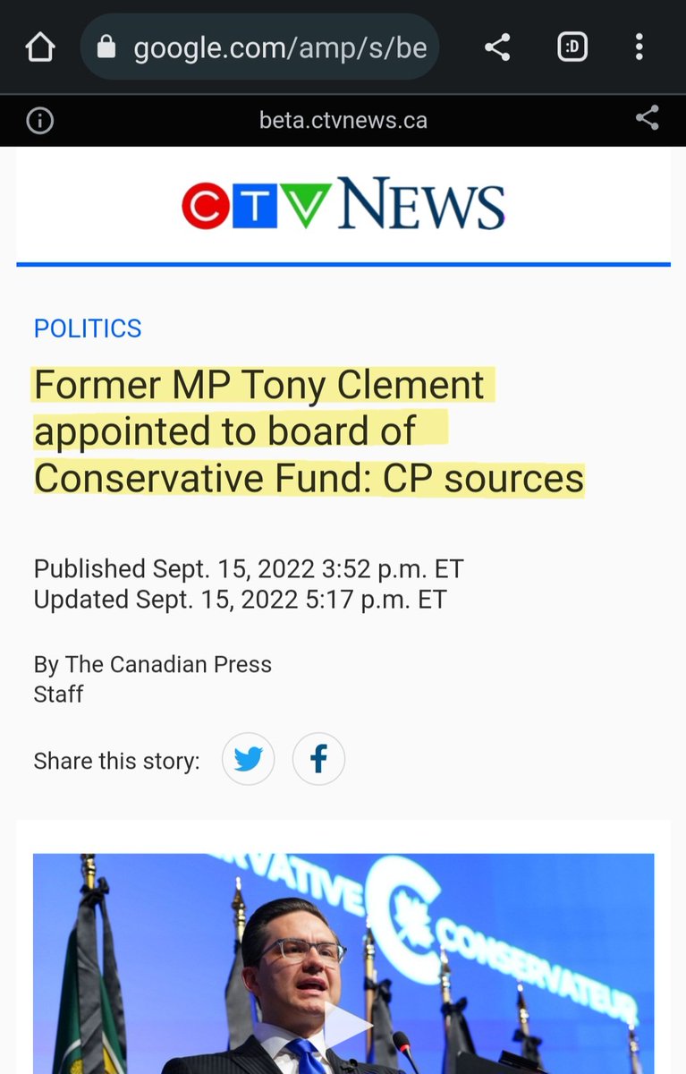 2) In September of 2022, CTV News reported that CPC Leader, Pierre Poilievre, appointed former MP, Tony Clement, to serve on the board of the Conservative Fund, the party's main fundraising arm. https://t.co/LLoM1Aaty2